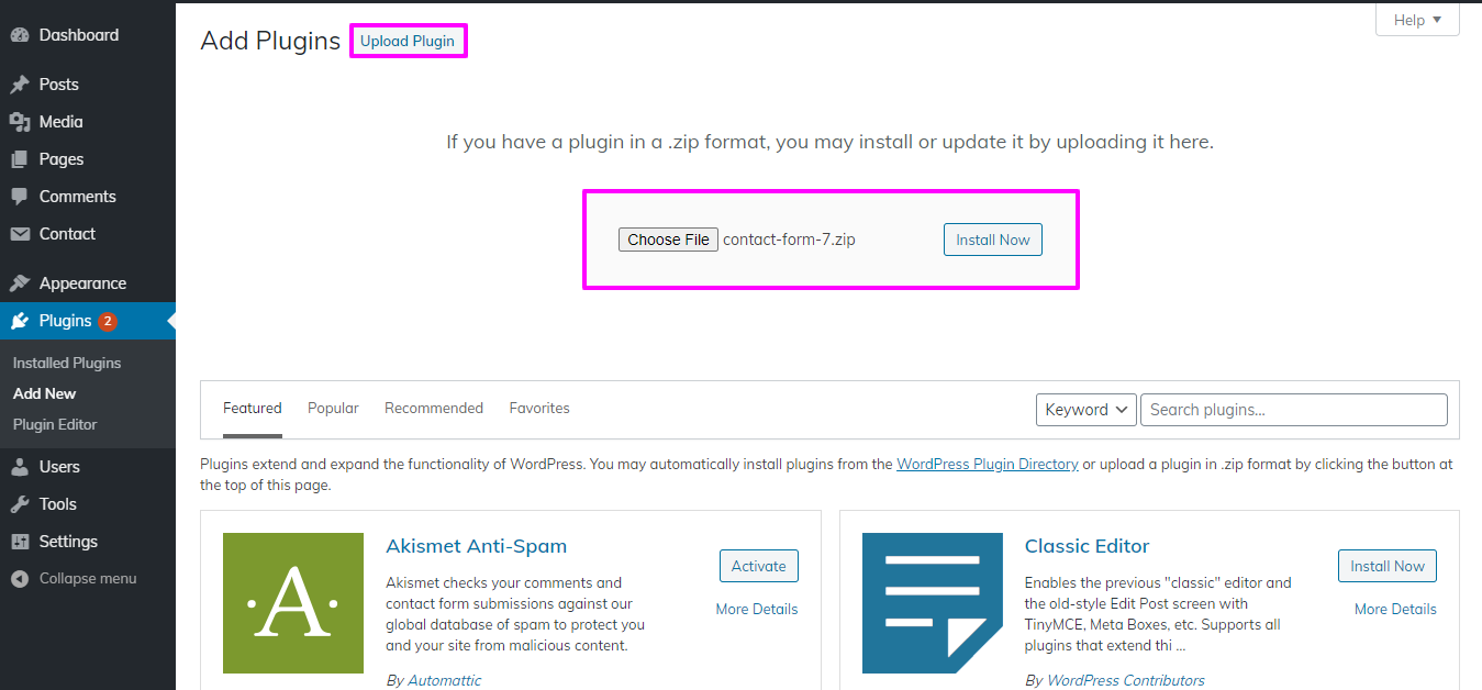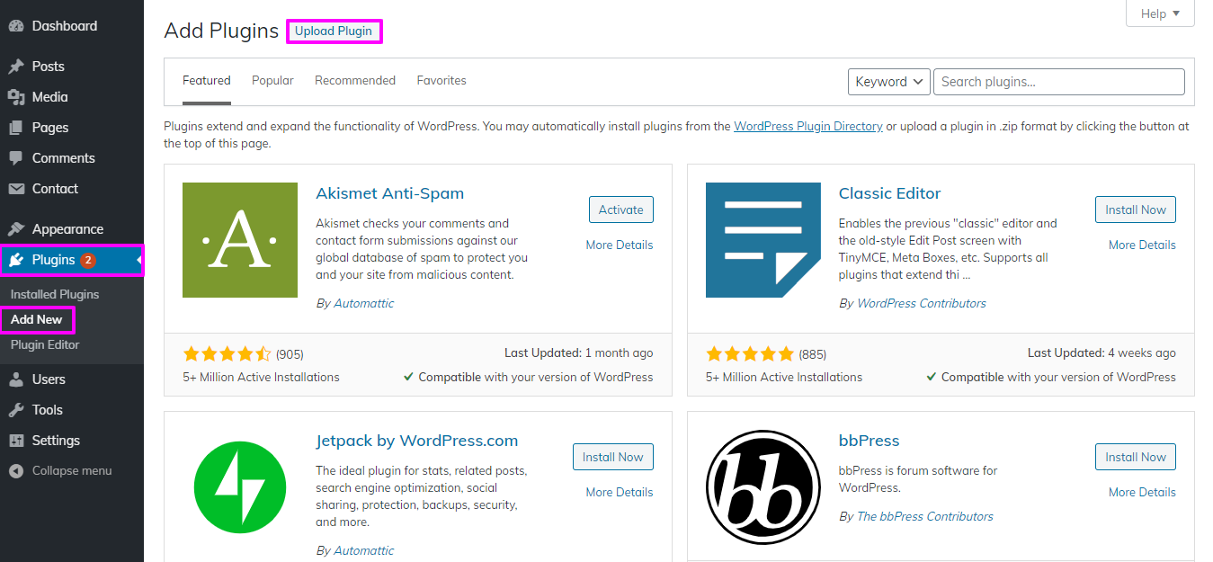 To manually add a WordPress plugin using a.zip archive, follow the steps listed below.