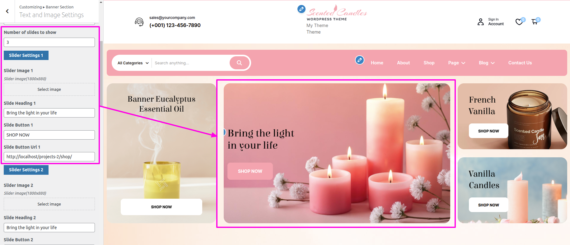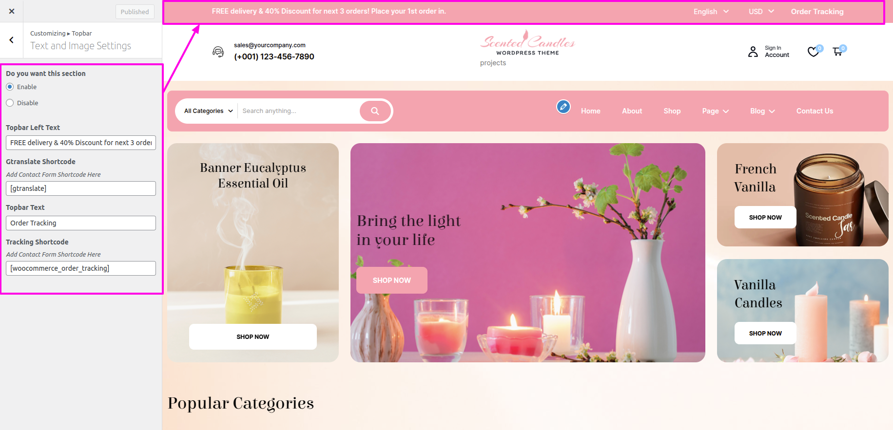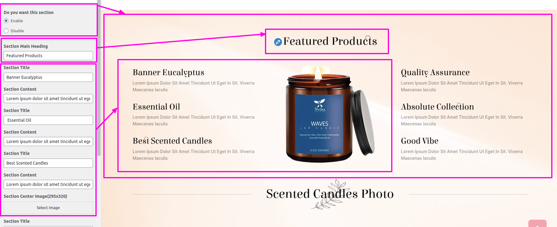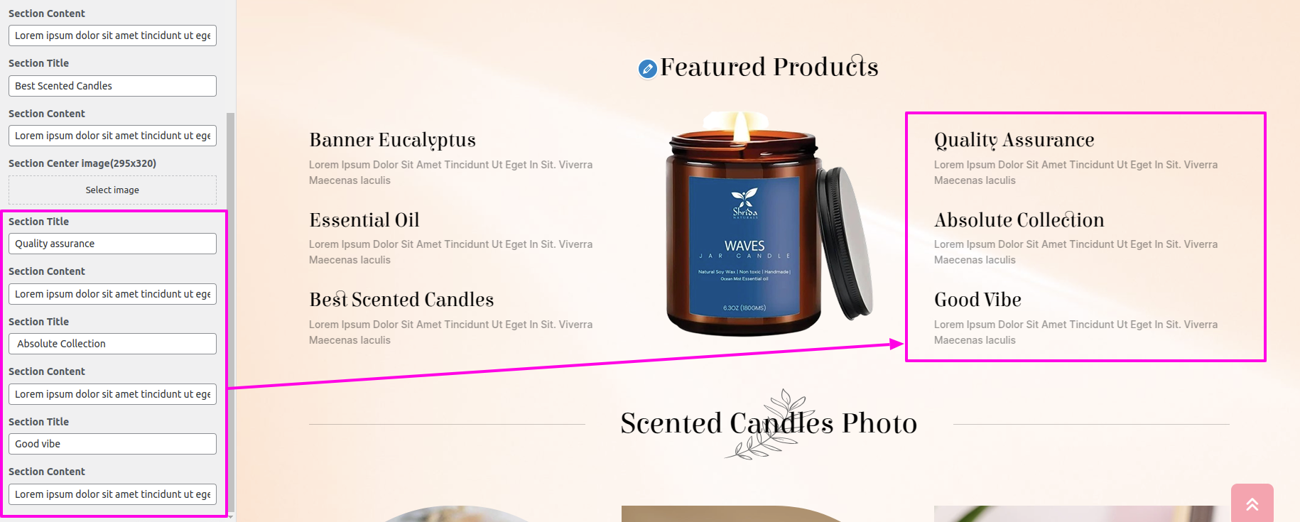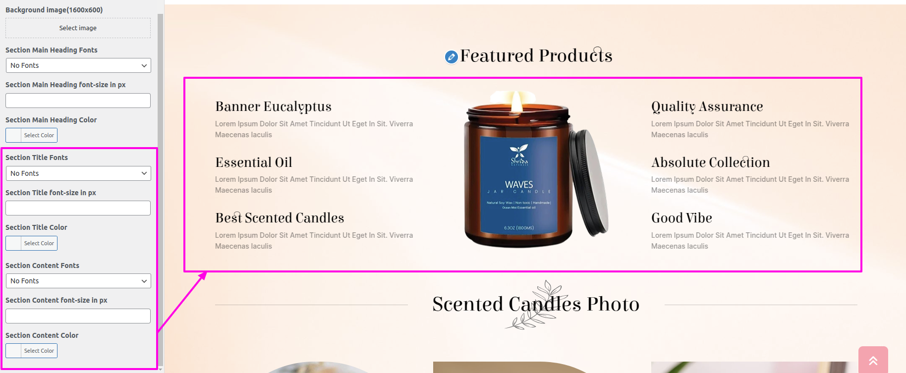 Select The Appearance → Select The Customize → Theme Settings → Scented Candles Photo → Text Settings
