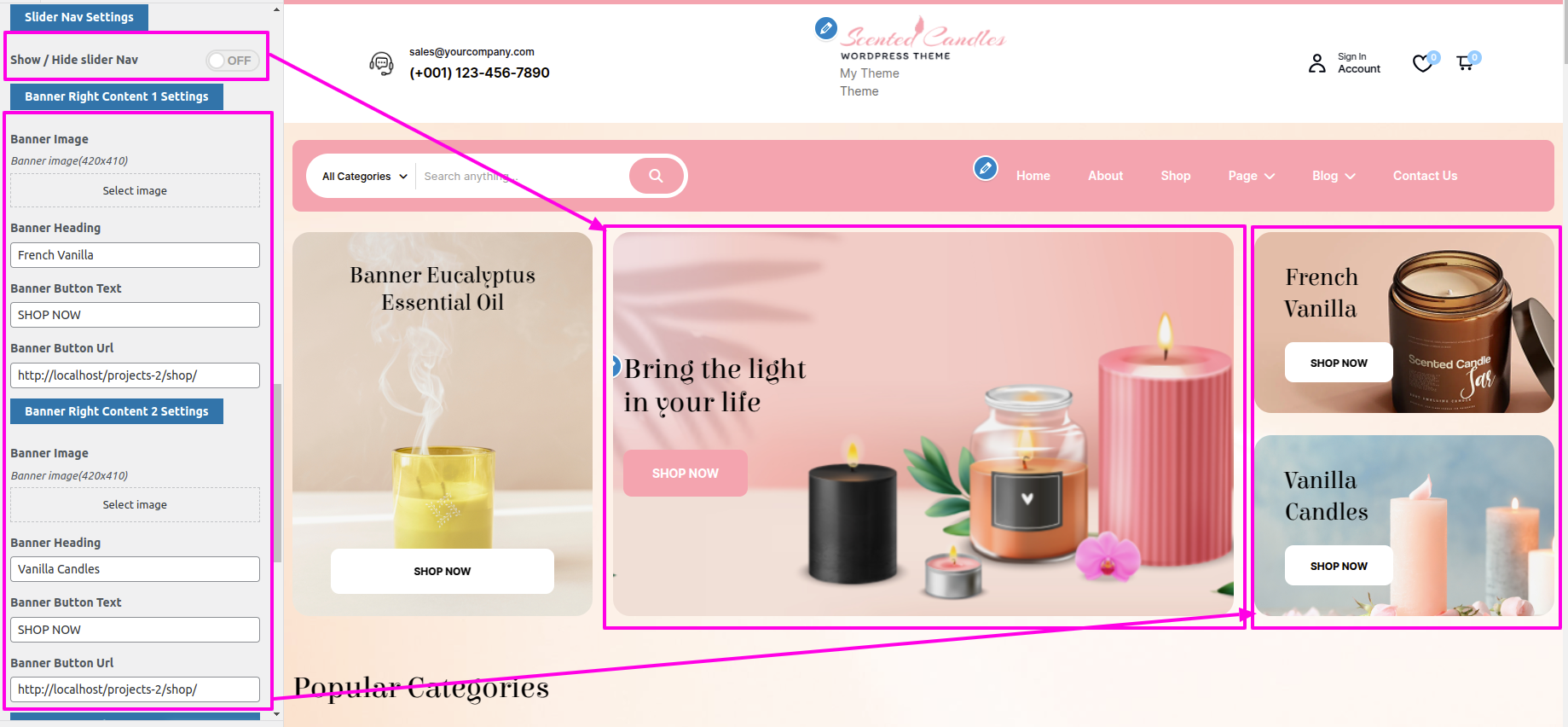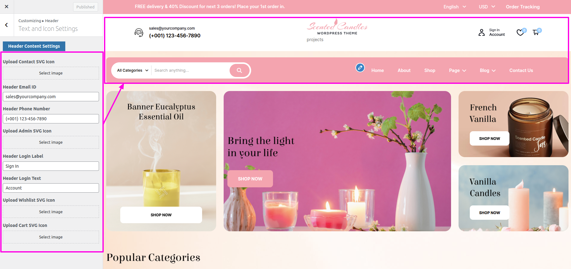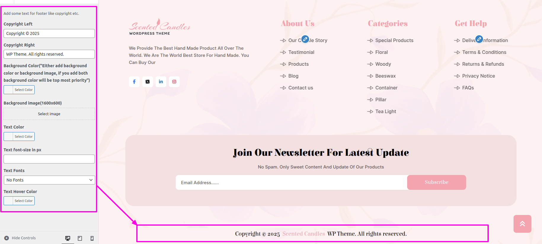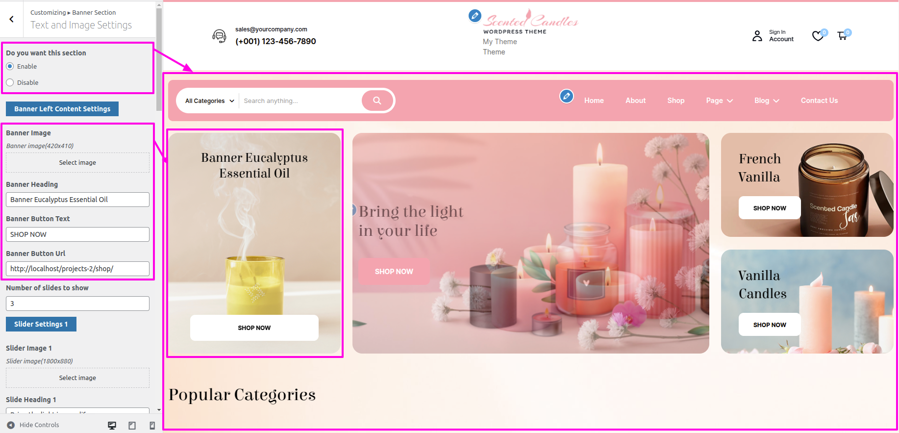 Select The Appearance → Select The Customize → Theme Settings → Scented Candles Photo → Text Settings
