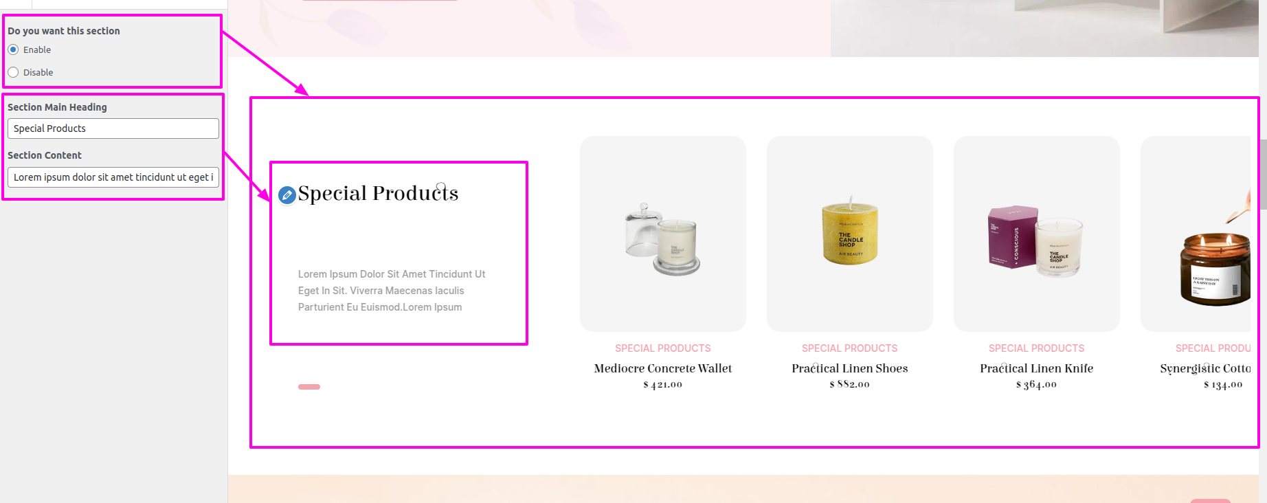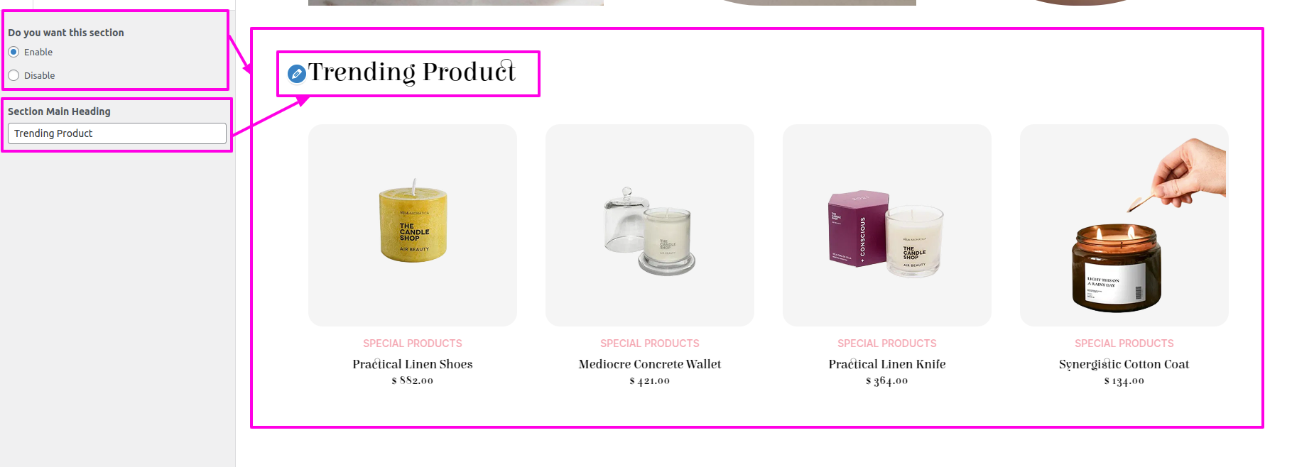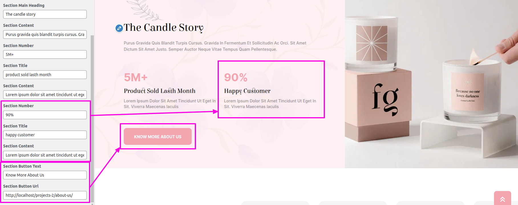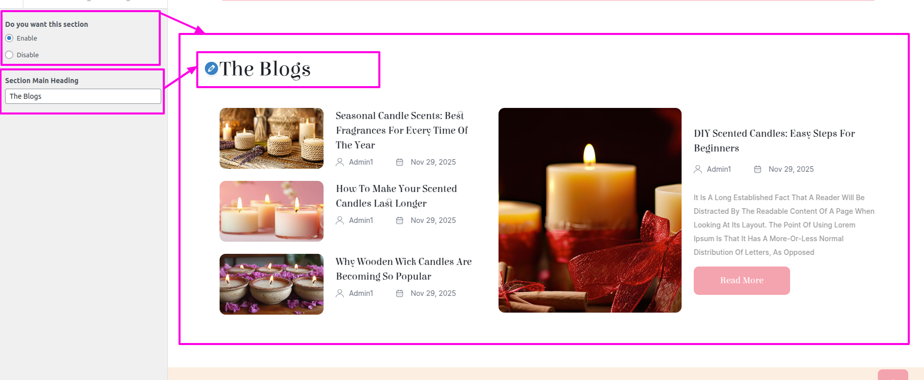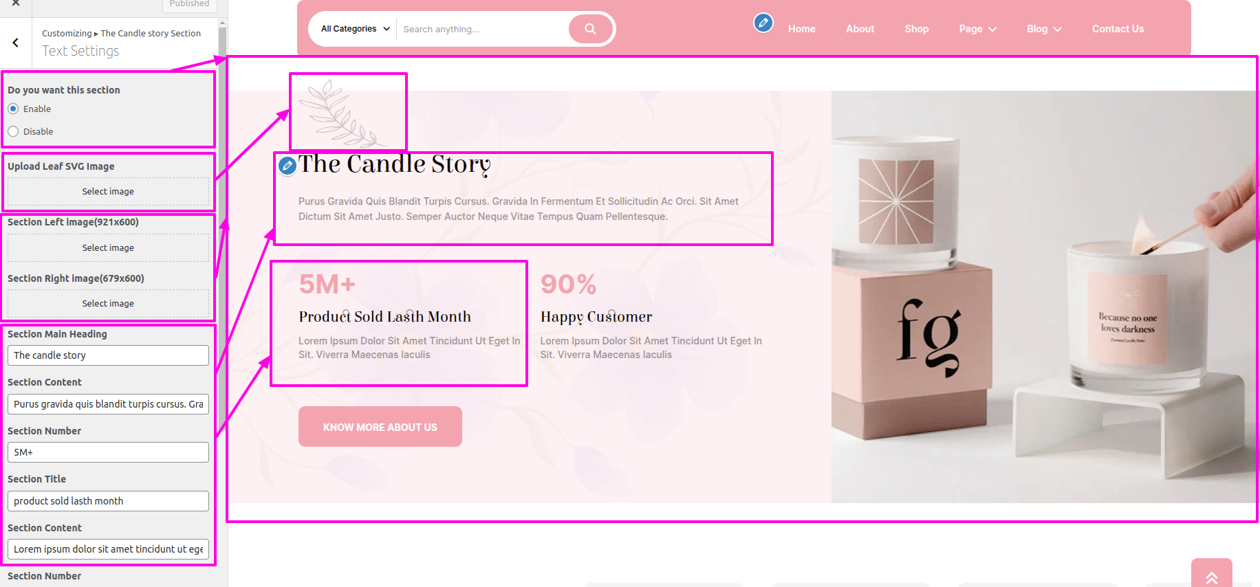 Select The Appearance → Select The Customize → Theme Settings → Scented Candles Photo → Text Settings