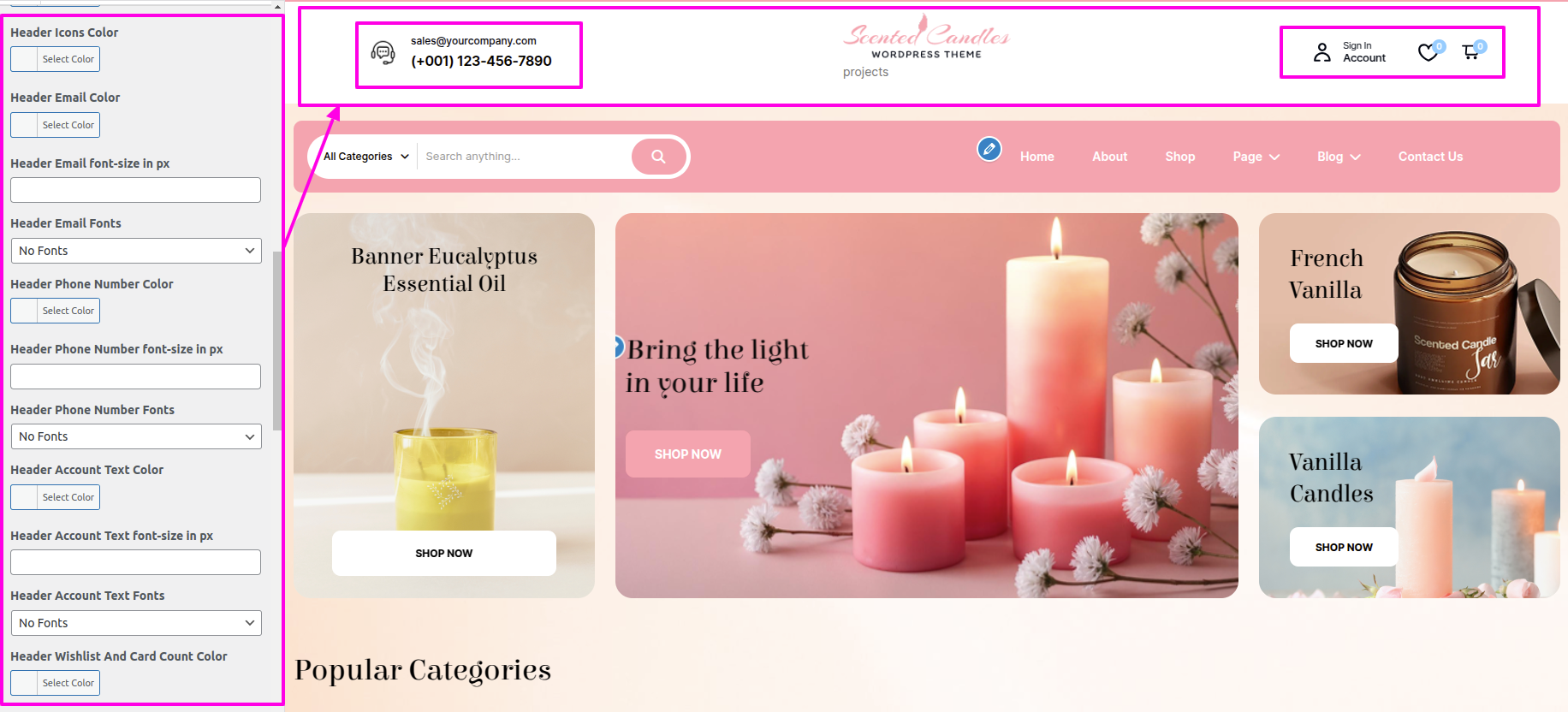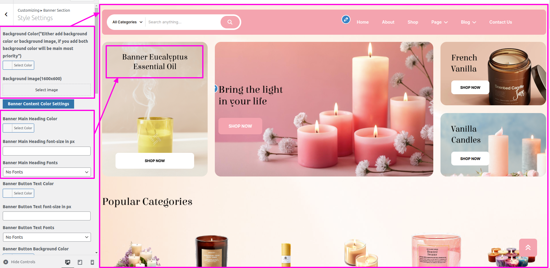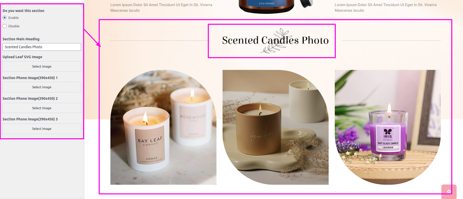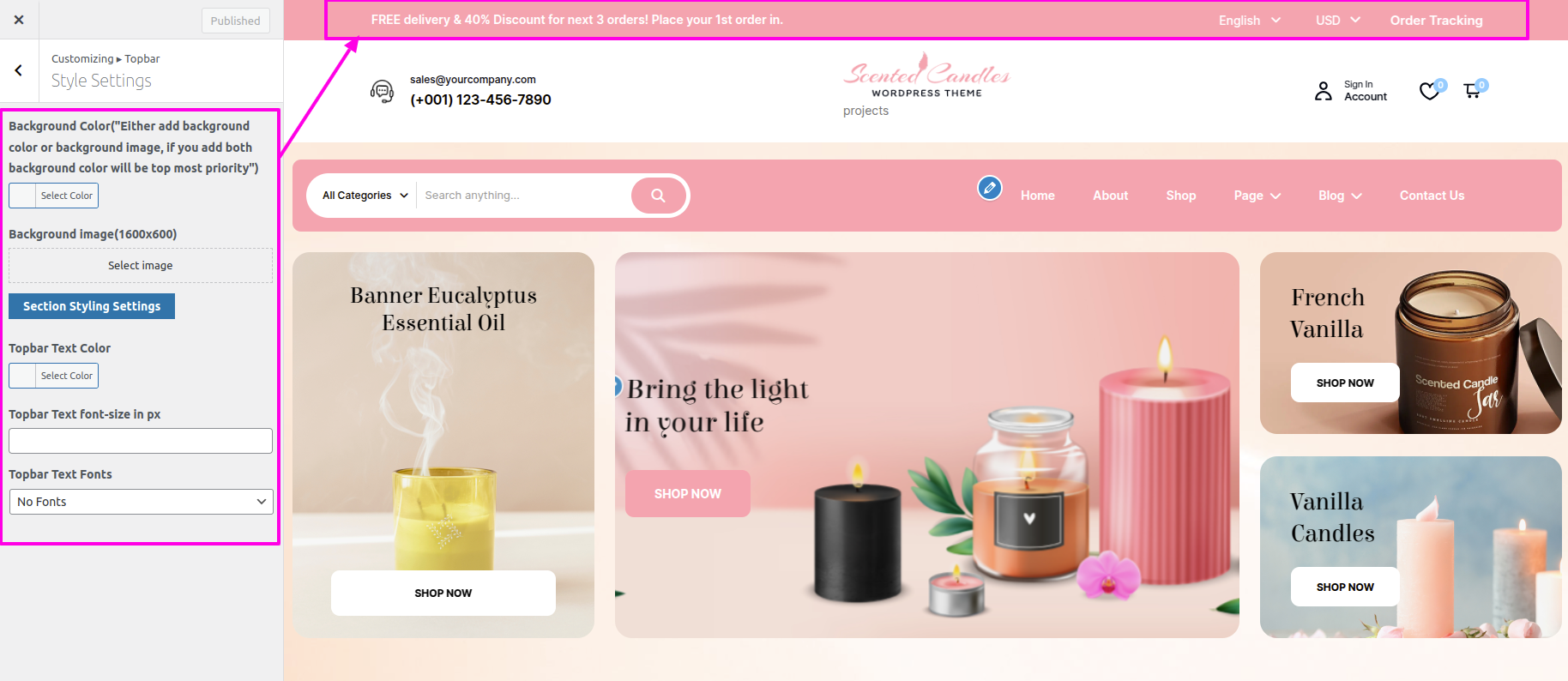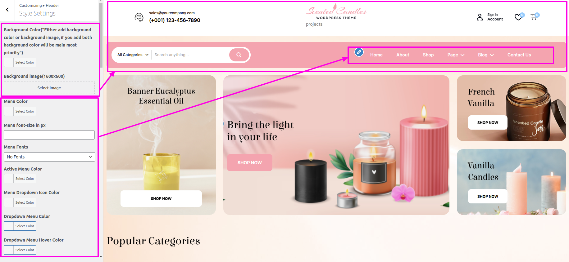 Select The Appearance → Select The Customize → Theme Settings → Scented Candles Photo → Style Settings