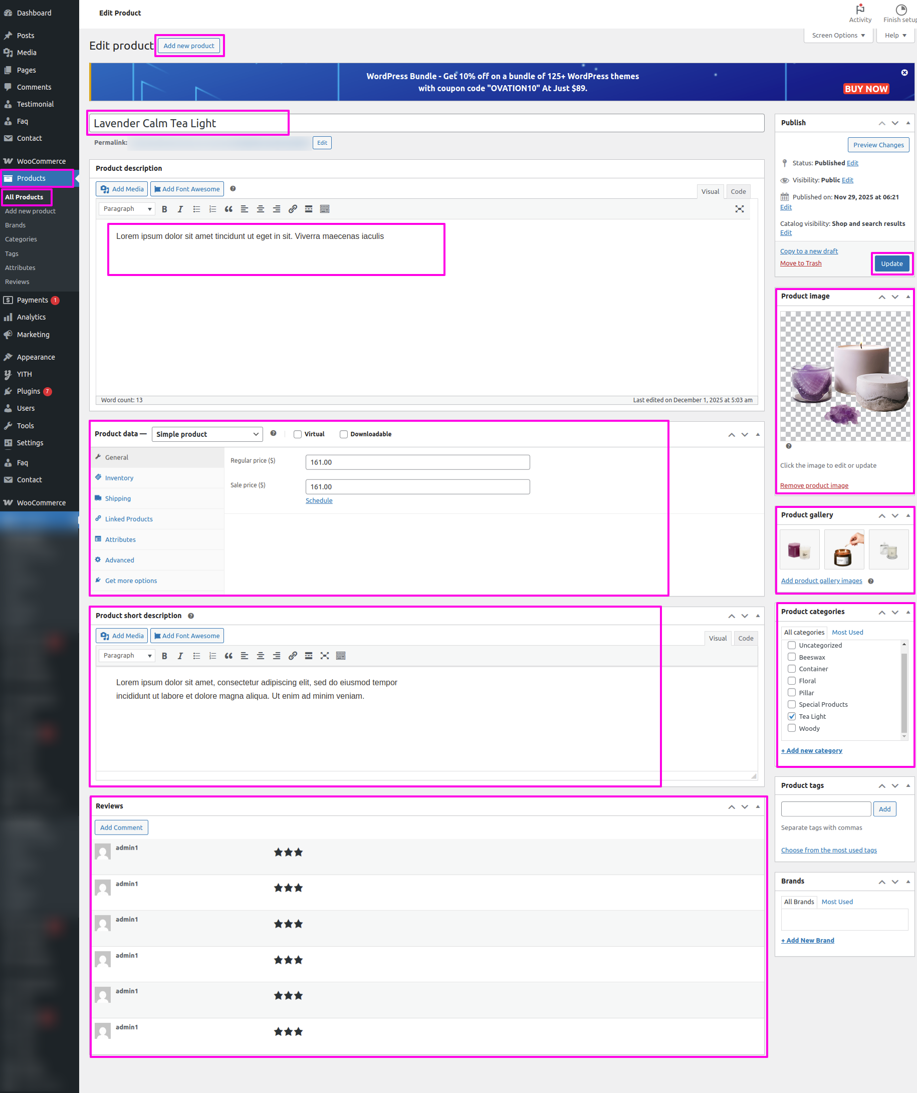 We need to install and activate Candles Shop Pro Custom Posttype Plugin. After activation, The Products option will appear on the dashboard after installation.