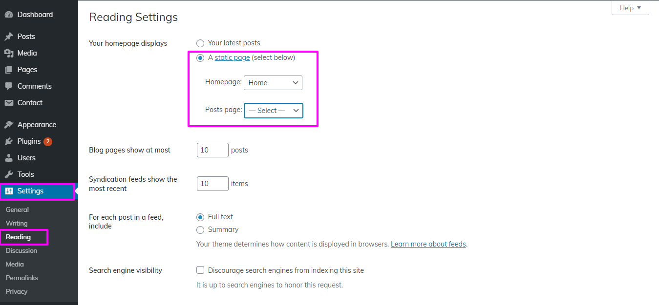 2) Set the page: Select Setting → Reading → Set the post page display static page to the Home page.