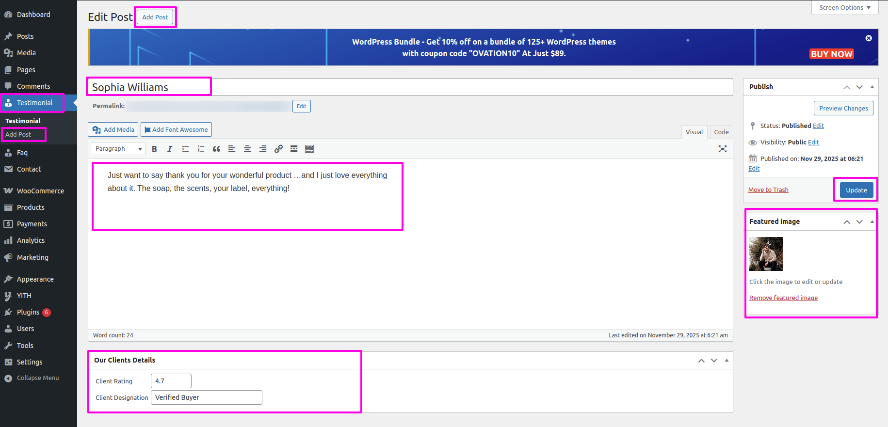 To ensure that Configuring the following section Navigate to Dashboard >> Testimonial >>Click On Add new