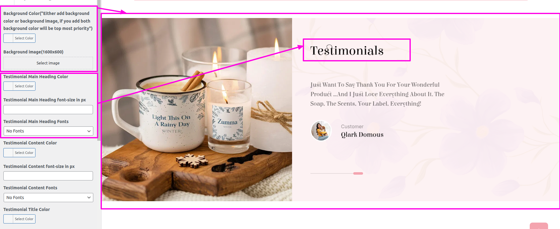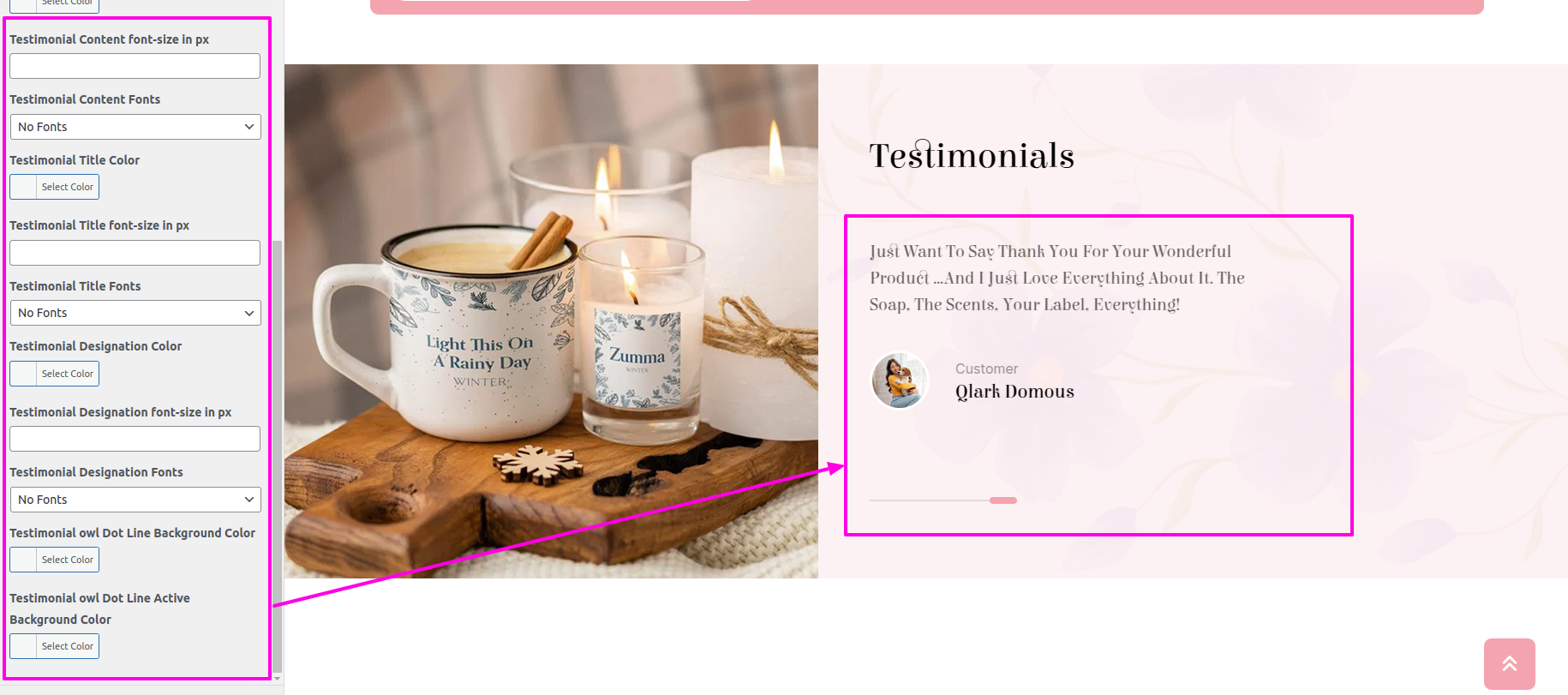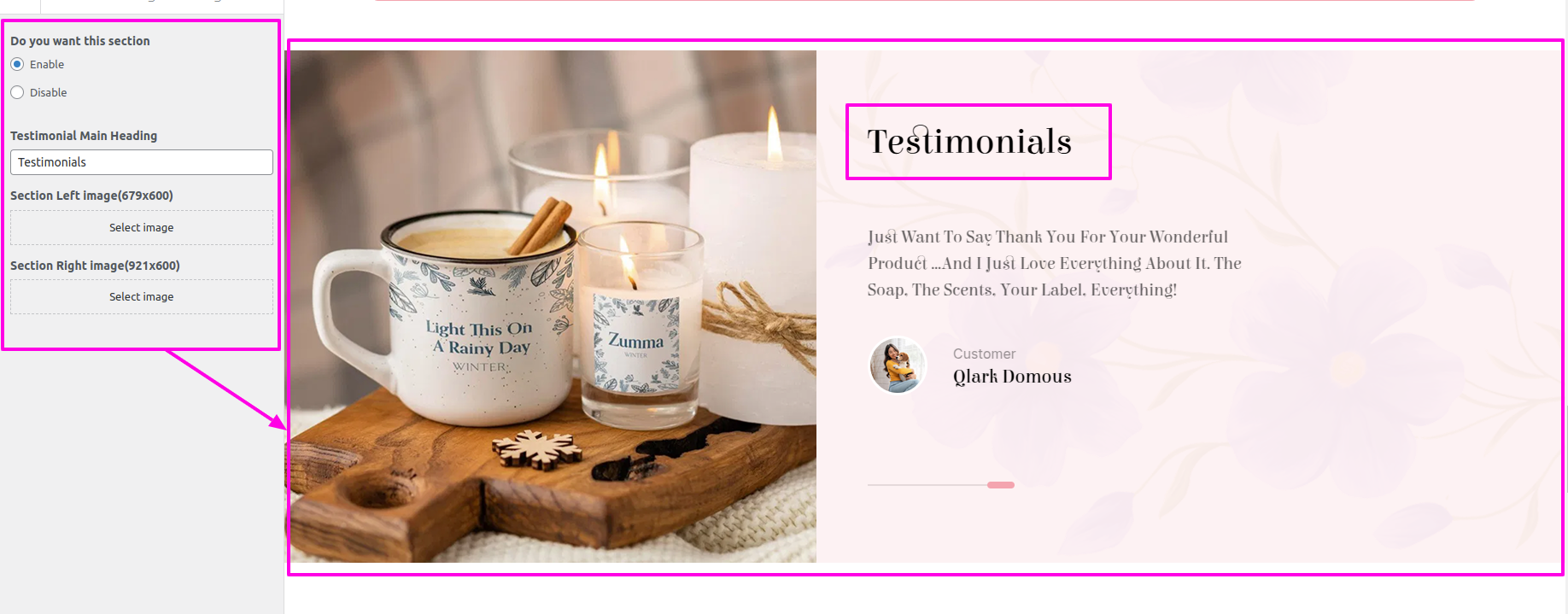 Installation and activation of the Candles Shop Pro Posttype Plugin are required for the Testimonial section. The dashboard's Testimonial section will show up after activation.