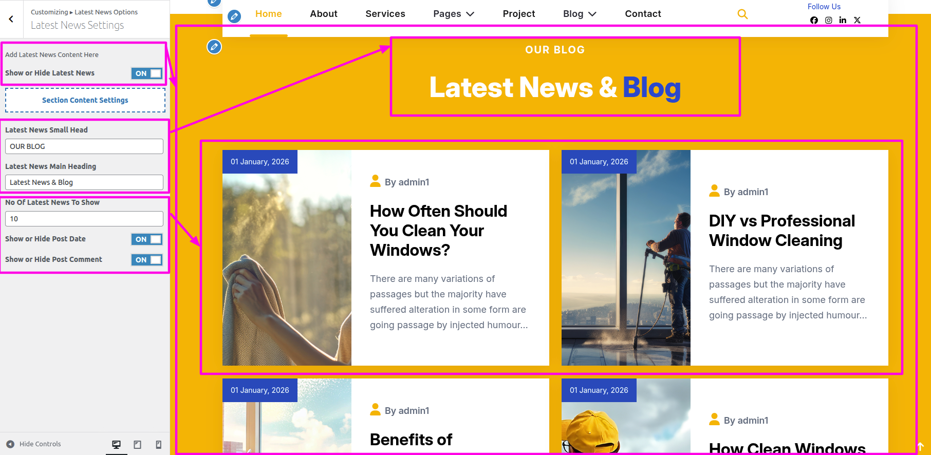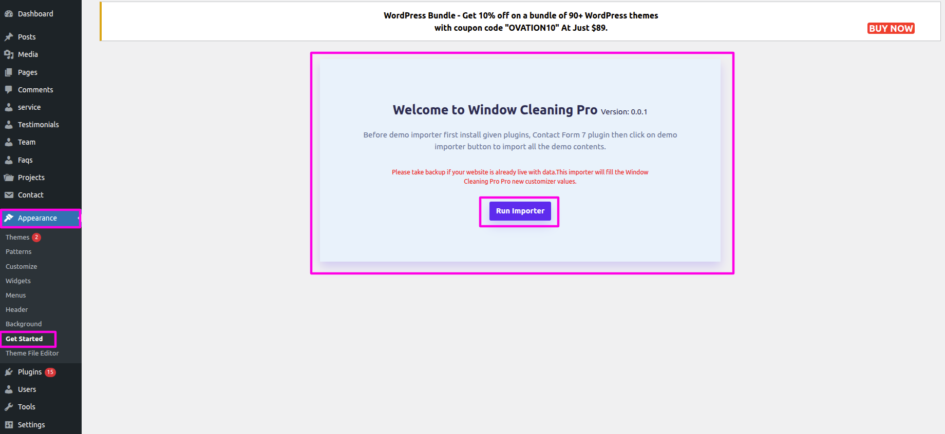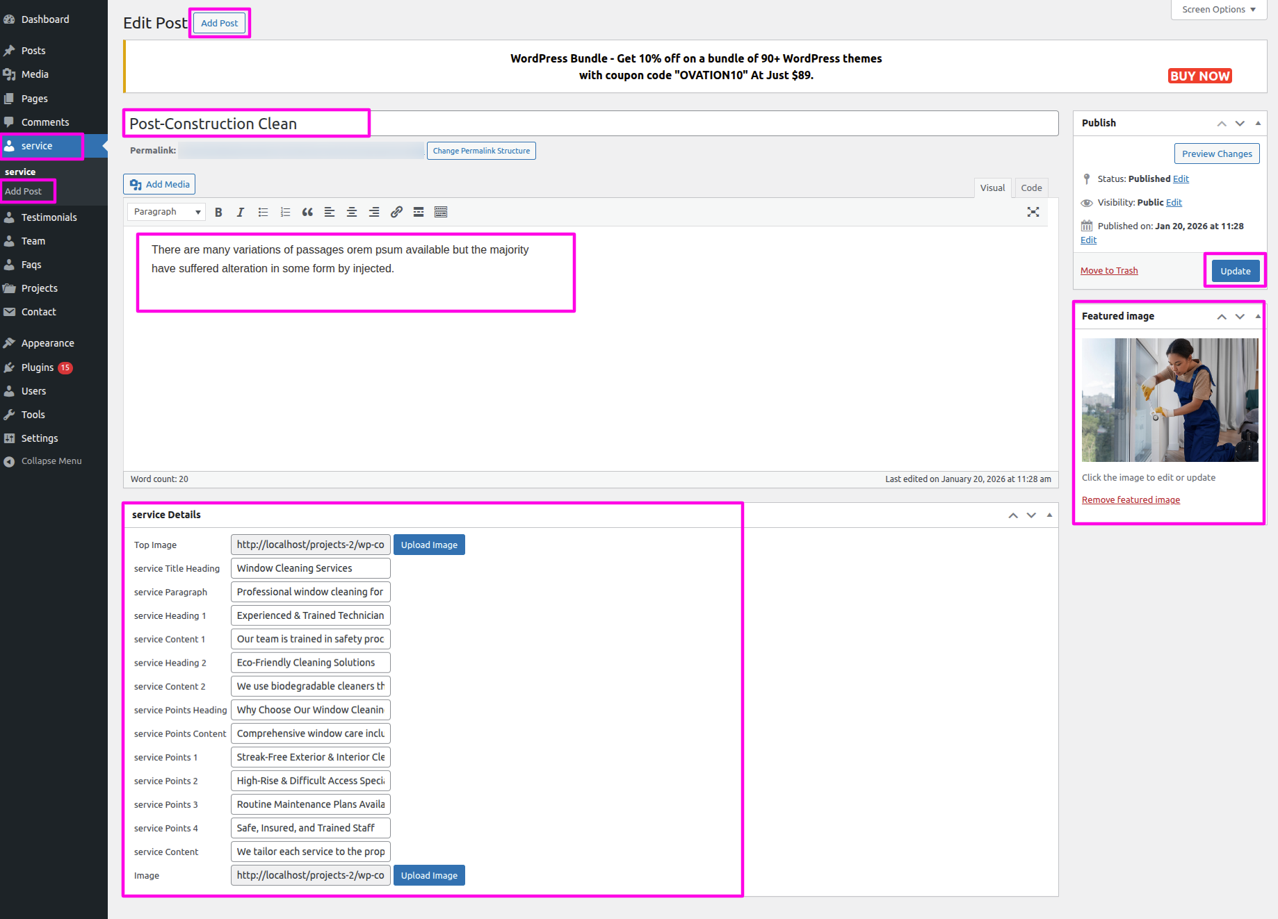 Installation and activation of the Window Cleaning Pro Posttype Plugin are required for the Our Services section. The dashboard's Our Services section will show up after activation.