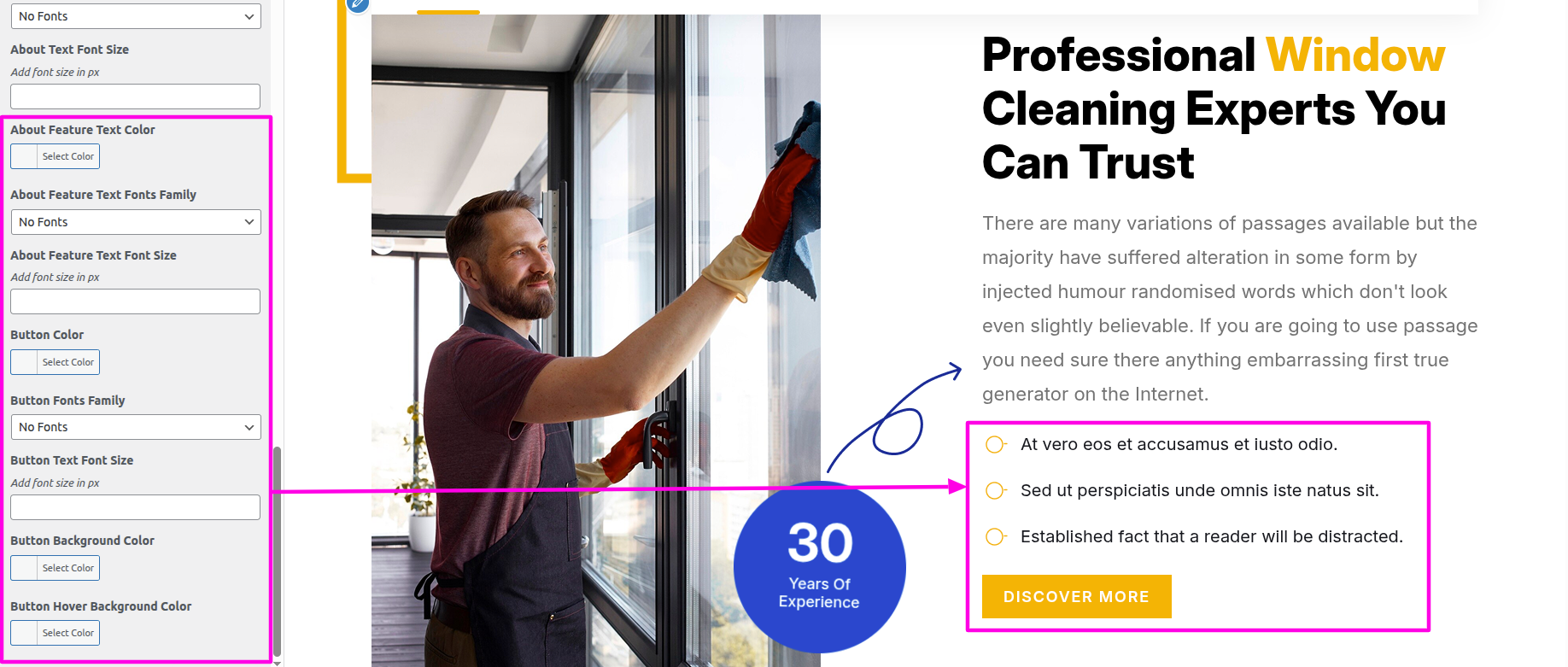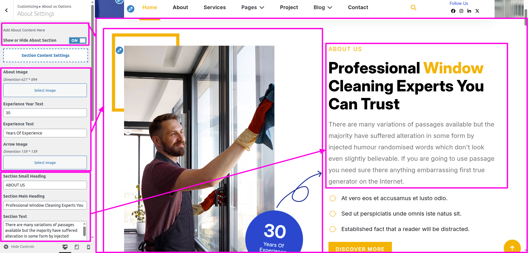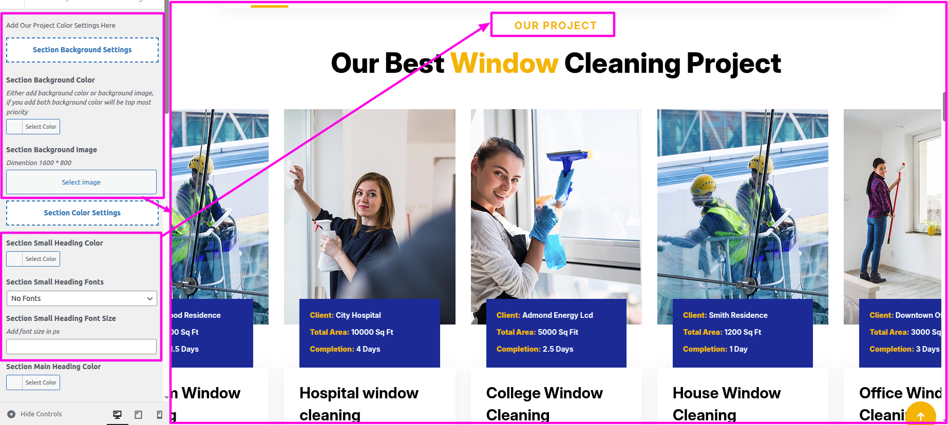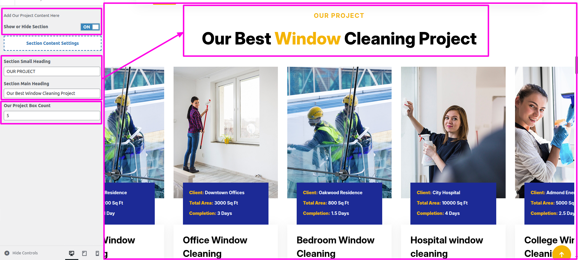 Installation and activation of the Window Cleaning Pro Posttype Plugin are required for the Our Services section. The dashboard's Our Services section will show up after activation.