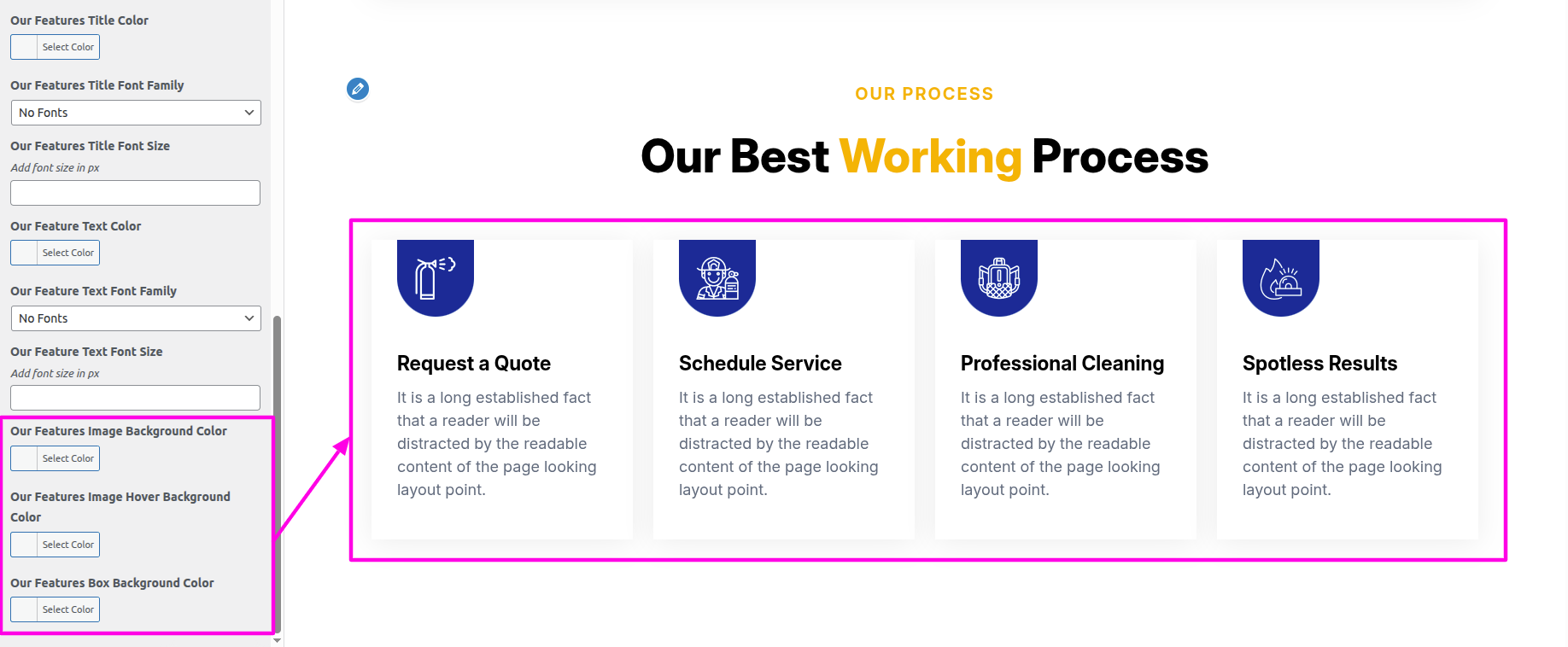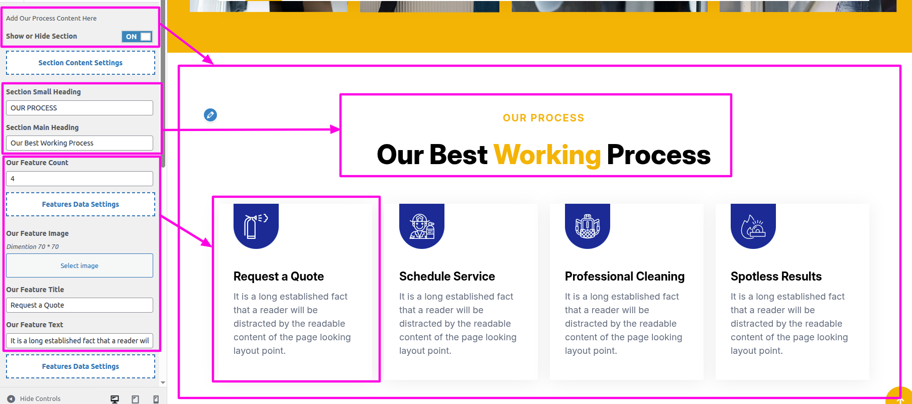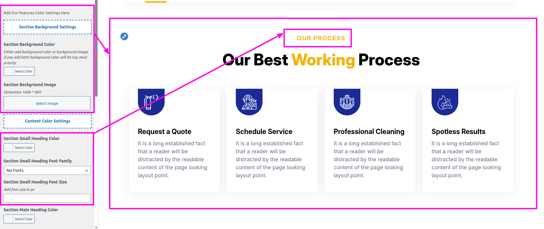 Select The Appearance → Select The Customize → Theme Settings → Our Process → Settings