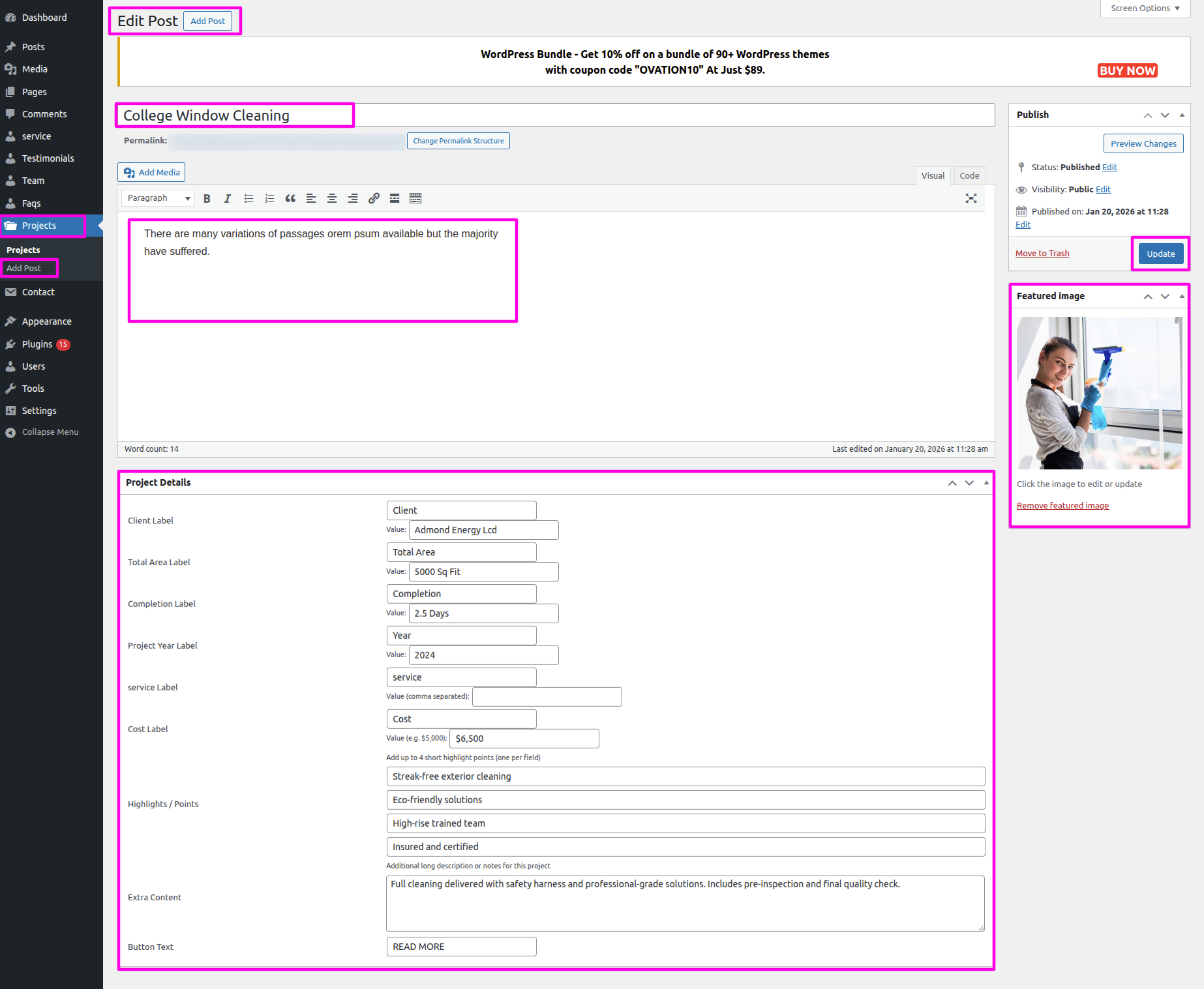 Installation and activation of the Window Cleaning Pro Posttype Plugin are required for the Projects section. The dashboard's Projects section will show up after activation.