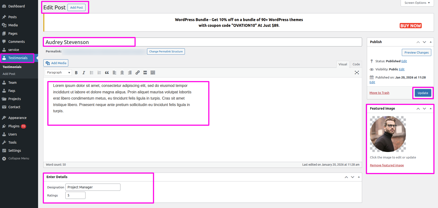 To ensure that Configuring the following section Navigate to Dashboard >> Testimonial >>Click On Add new