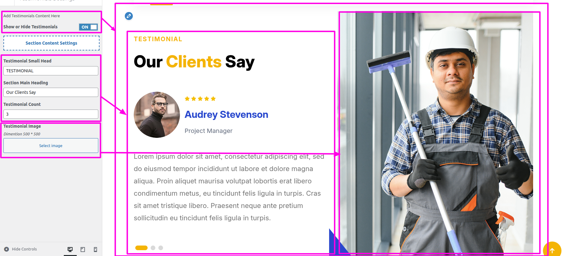 Installation and activation of the Window Cleaning Pro Posttype Plugin are required for the Testimonial section. The dashboard's Testimonial section will show up after activation.