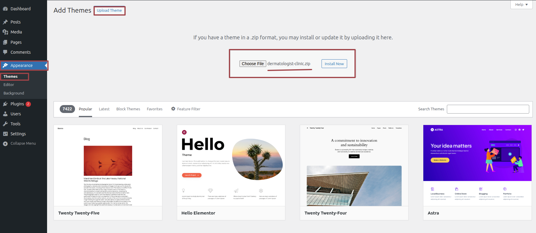 Extract the zipped package downloaded from Wordpress.org to your desktop, in the extracted package you will find the "dermatologist-clinic.zip" file which is the WordPress theme.