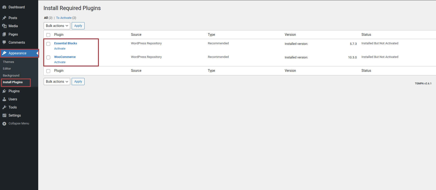 Consequently, at this point you have probably seen a warning urging you to install suggested plugins. This is required for the theme to function flawlessly with the Theme Panel plugin and a few other plugins. It's really easy to install; all you have to do is click Start installing plugins, and you'll be sent to the plugin installation page where you can put in whatever plugin you want or need.