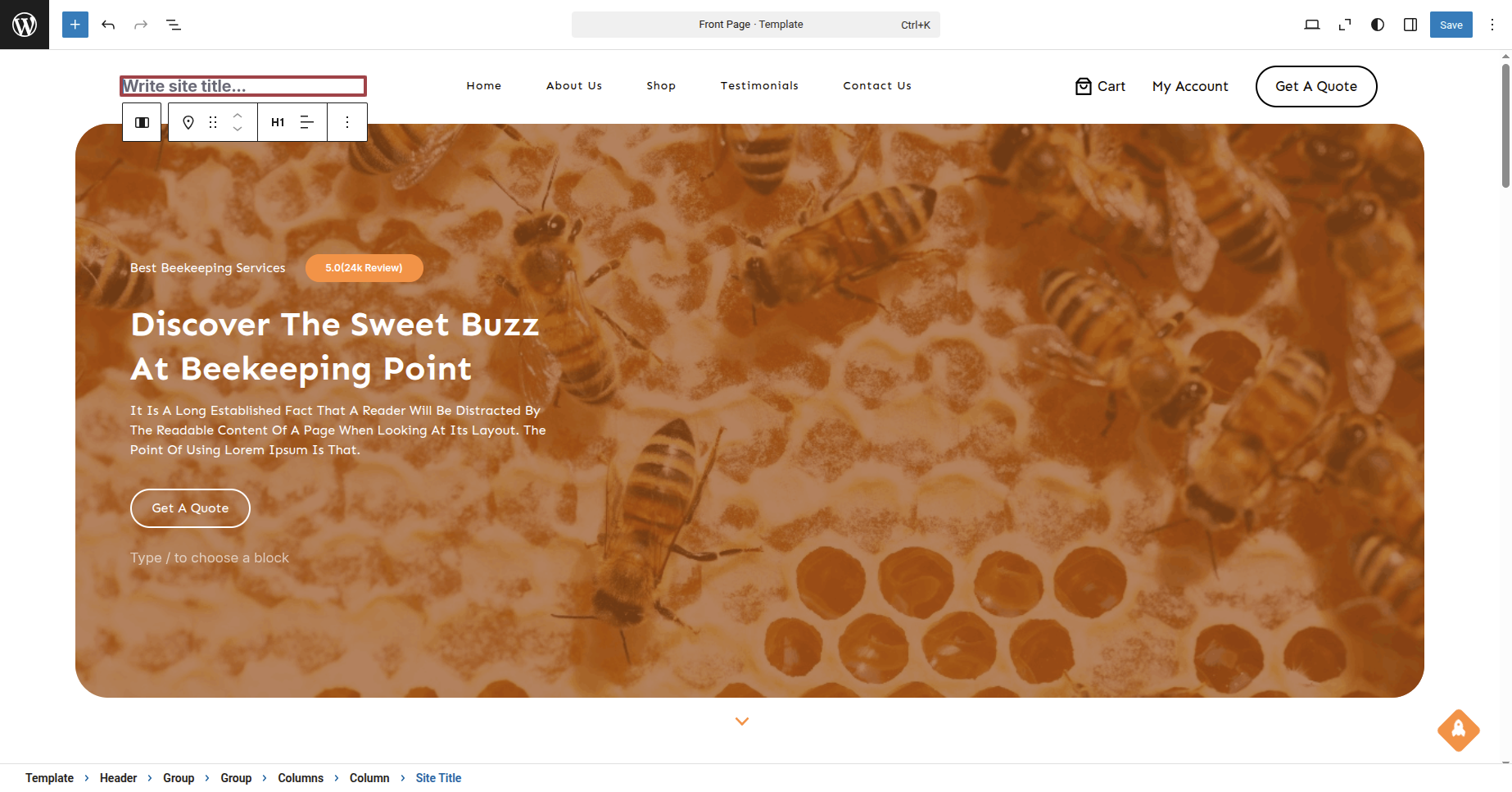 Write Your site title By selecting Site Title Block.