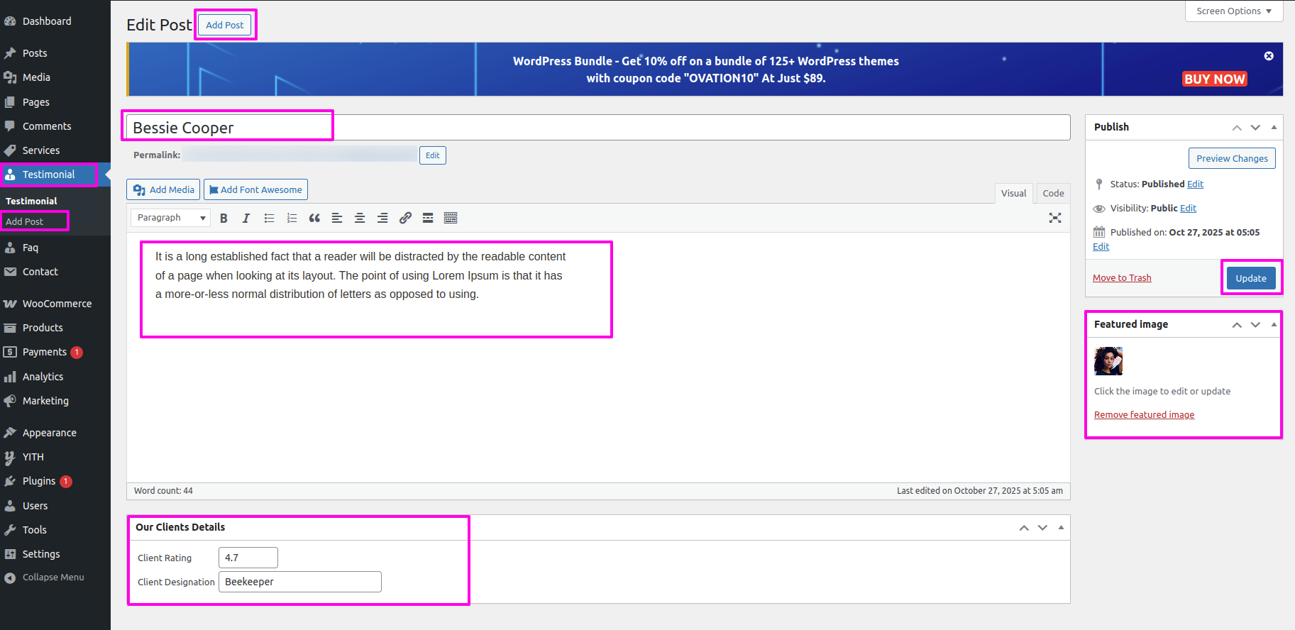 To ensure that Configuring the following section Navigate to Dashboard >> Testimonial >>Click On Add new