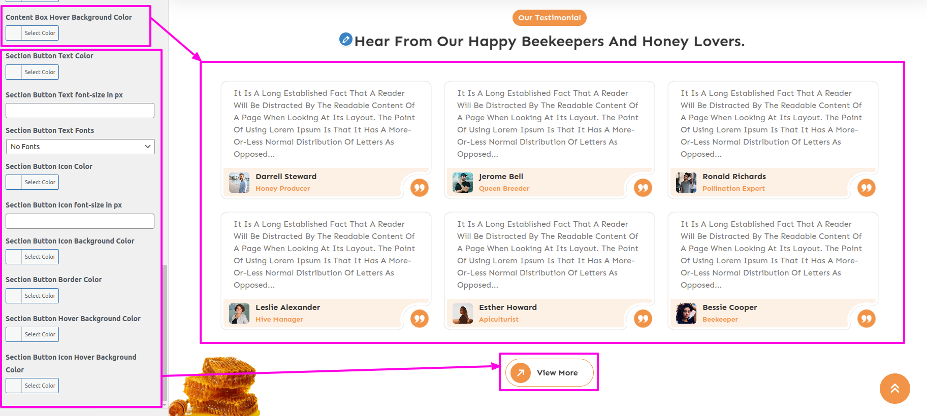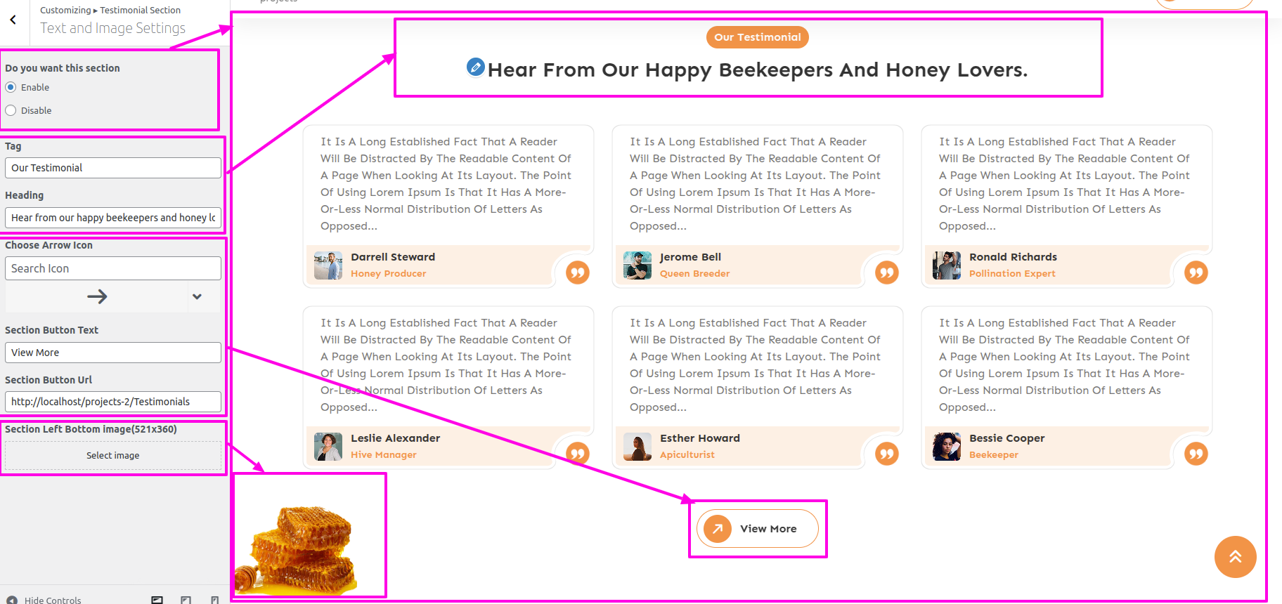 Installation and activation of the Honey Store Pro Posttype Plugin are required for the Testimonial section. The dashboard's Testimonial section will show up after activation.