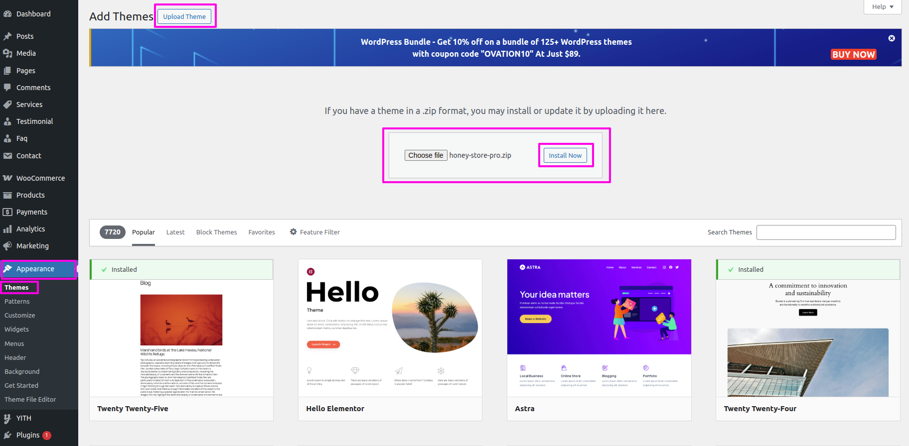 4. Select "Browse" to install the theme file and select it from your device the honey-store-pro theme theme on your WordPress website. Click "Install Now" to start the installation procedure after you've chosen the file.
