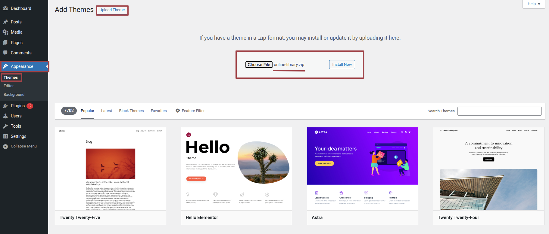 Extract the zipped package downloaded from Wordpress.org to your desktop, in the extracted package you will find the "online-library.zip" file which is the WordPress theme.