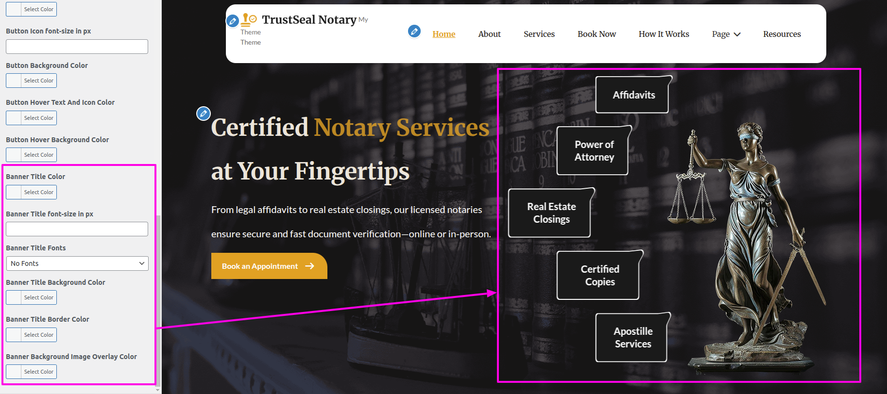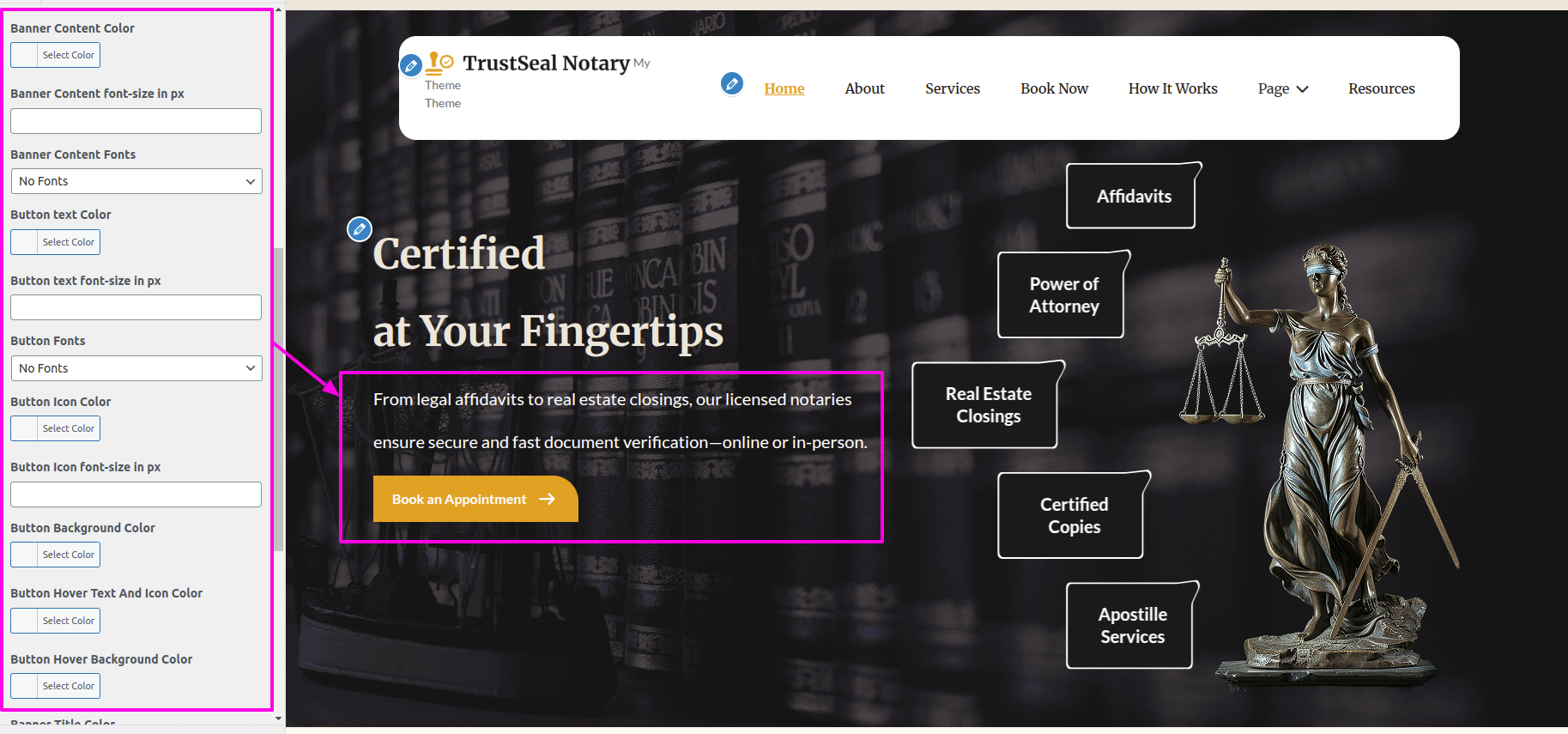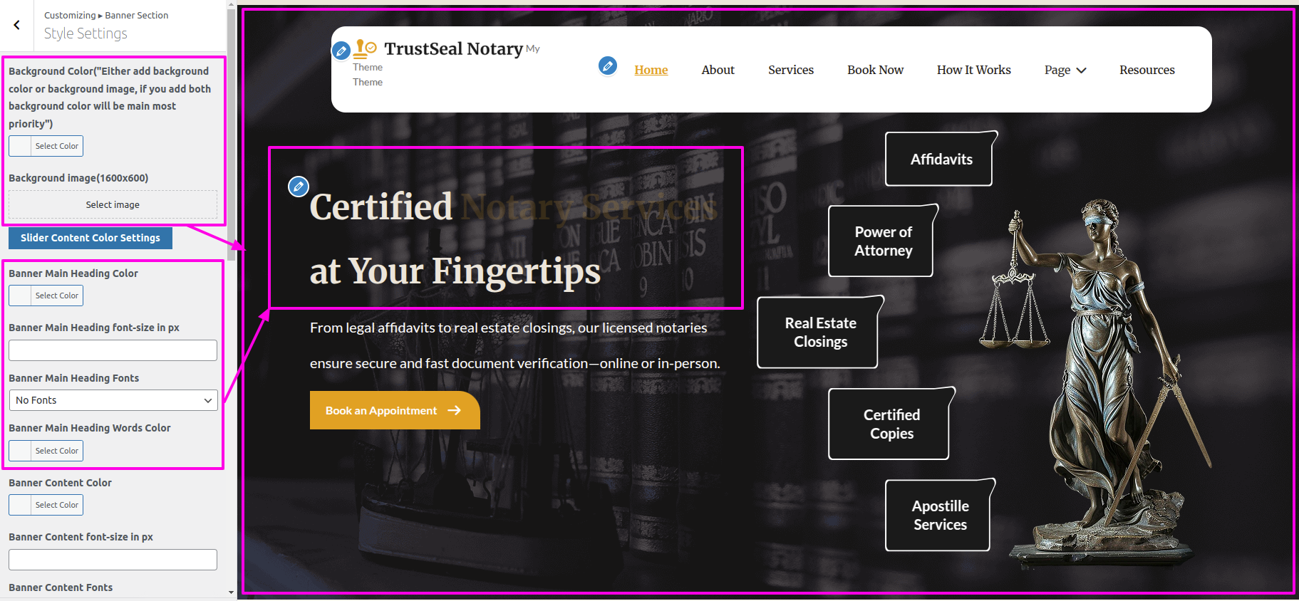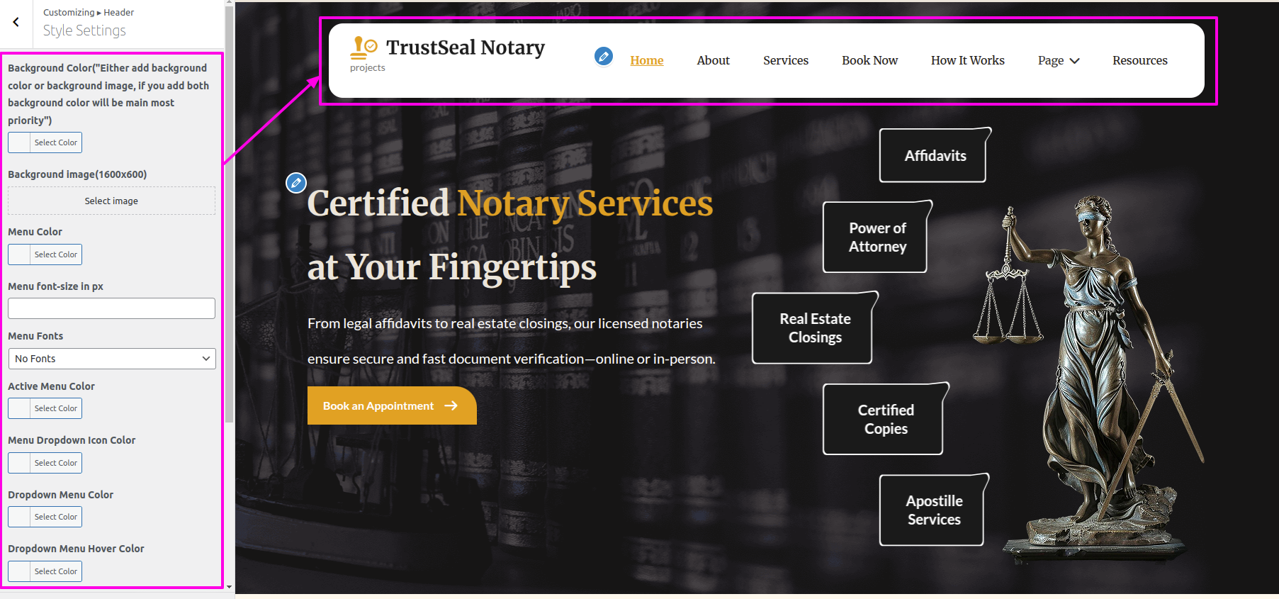Select The Appearance → Select The Customize → Theme Settings → Notarization for Businesses → Style Settings