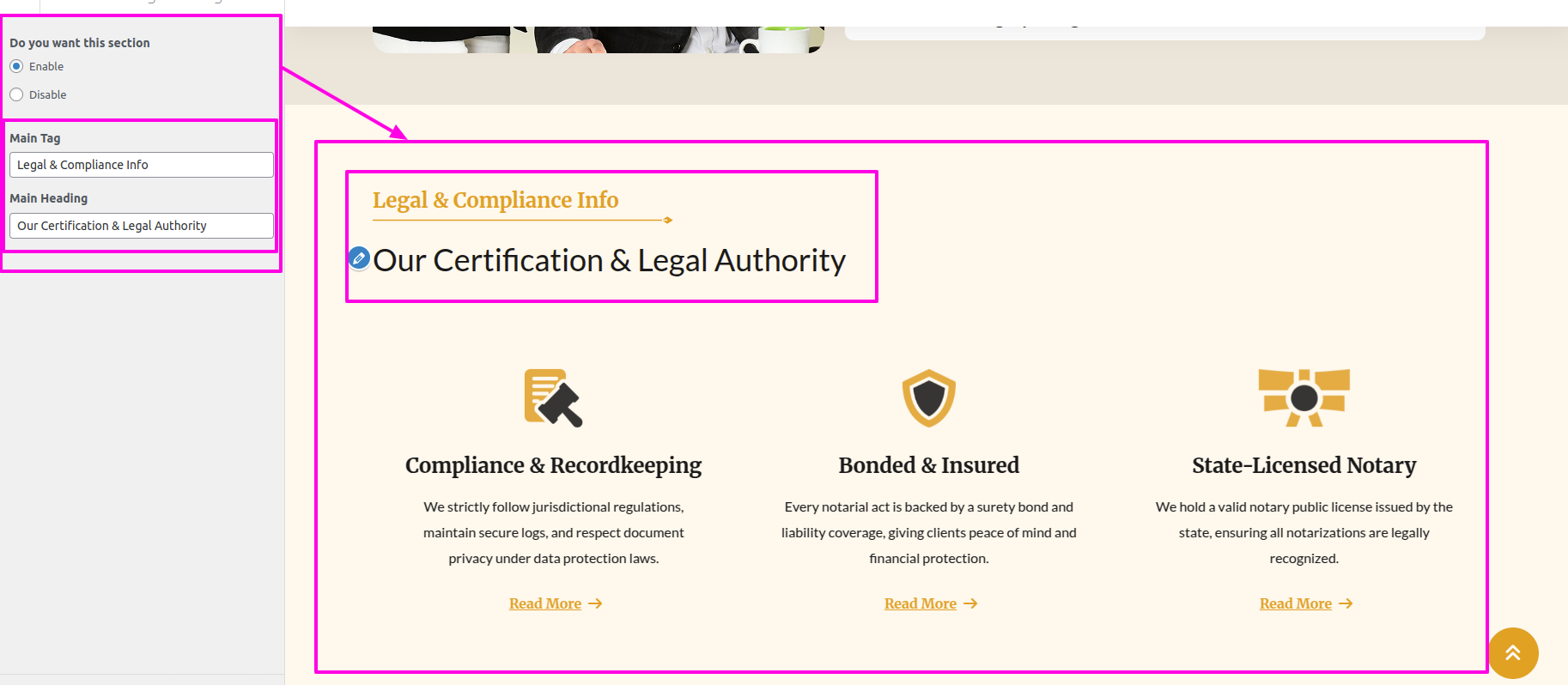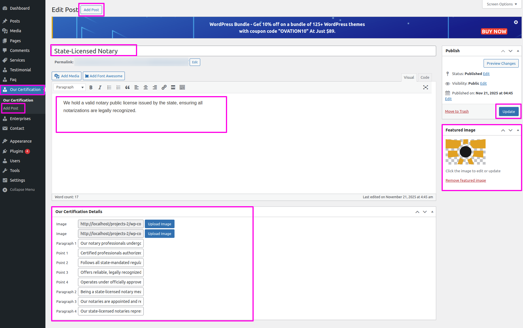 Installation and activation of the Online Notary Pro Posttype Plugin are required for the Our Certification section. The dashboard's Our Certification section will show up after activation.