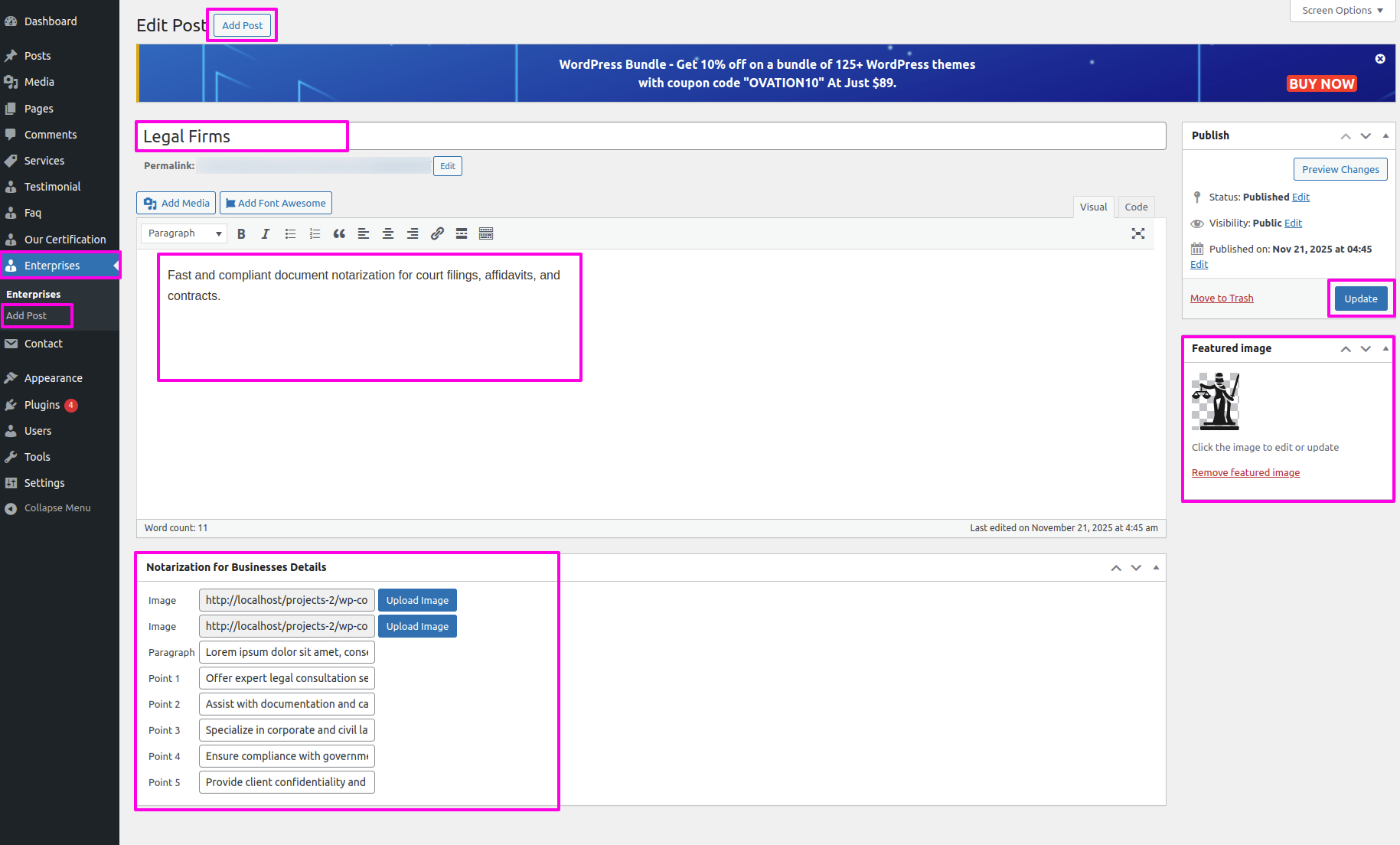 Installing and activating Online Notary Pro Custom Posttype Plugin is necessary for the Enterprises section. A plugin. After activation, the Enterprises section will appear in the dashboard.