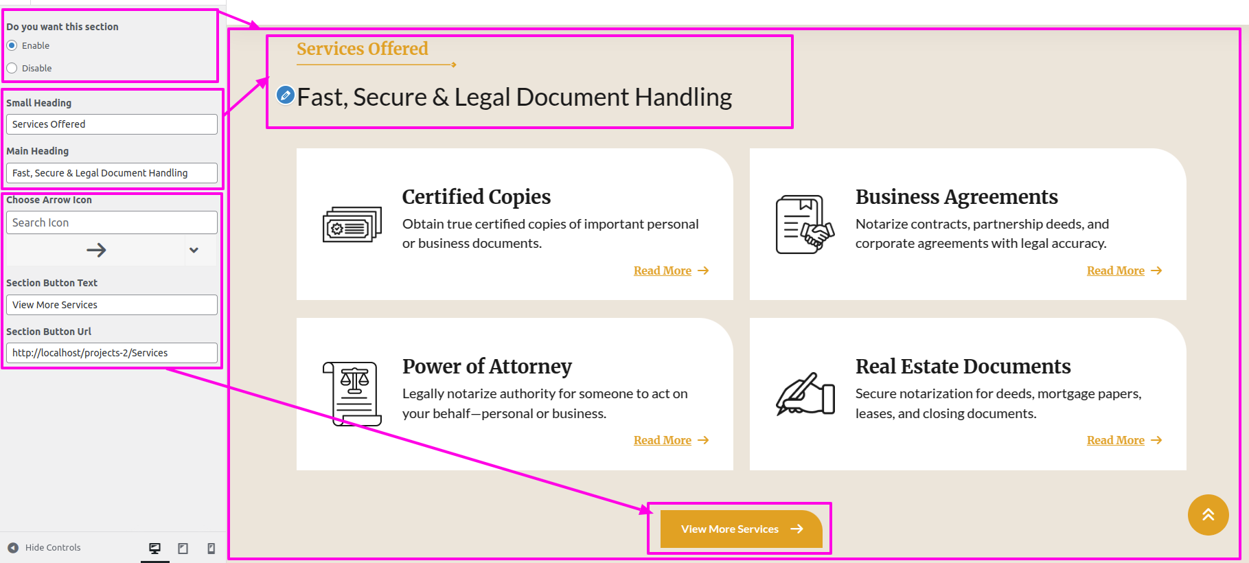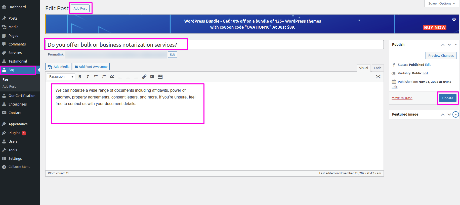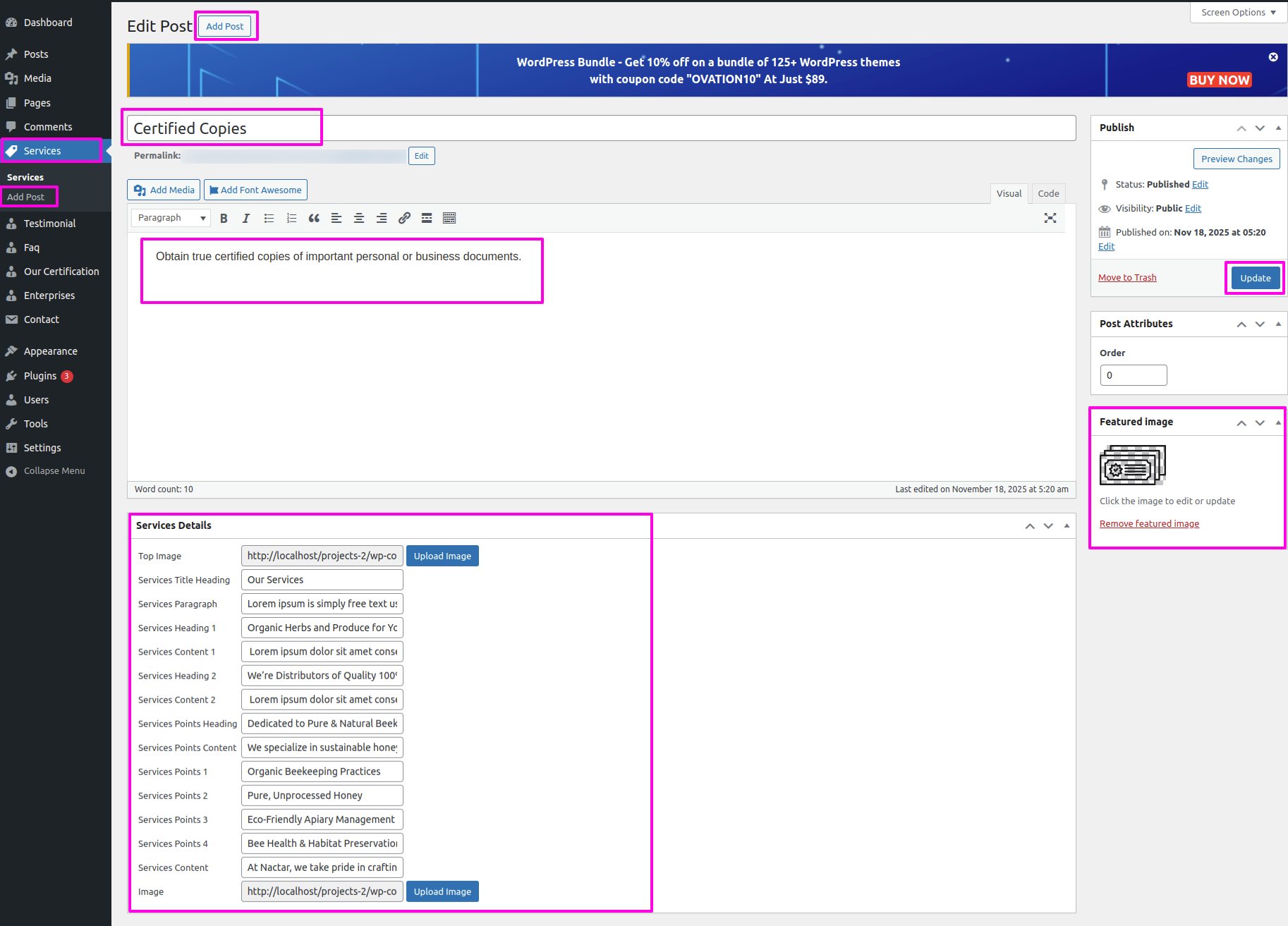 Installing and activating Online Notary Pro Custom Posttype Plugin is necessary for the Services section. A plugin. After activation, the Services section will appear in the dashboard.