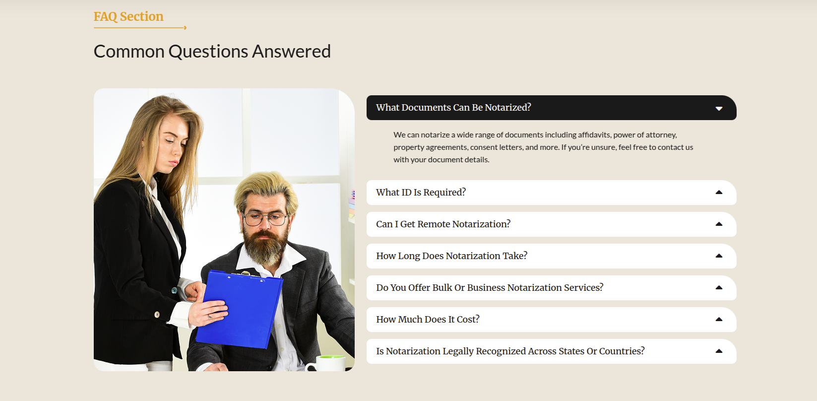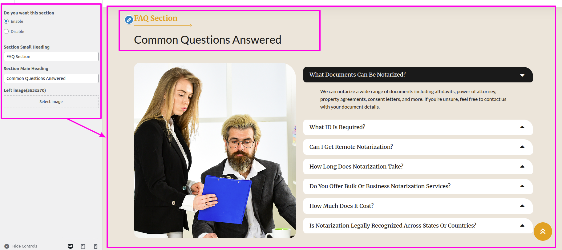 Installation and activation of the Online Notary Pro Posttype Plugin are required for the Faq section. The dashboard's Faq section will show up after activation.