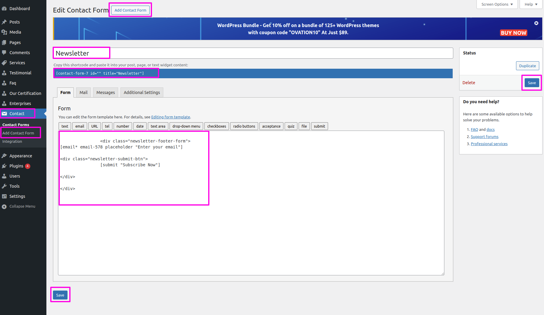 To start Configuring the Newsletter on your WordPress site, we need to install contact forn 7 plugin. contact options will appear once you install the plugin