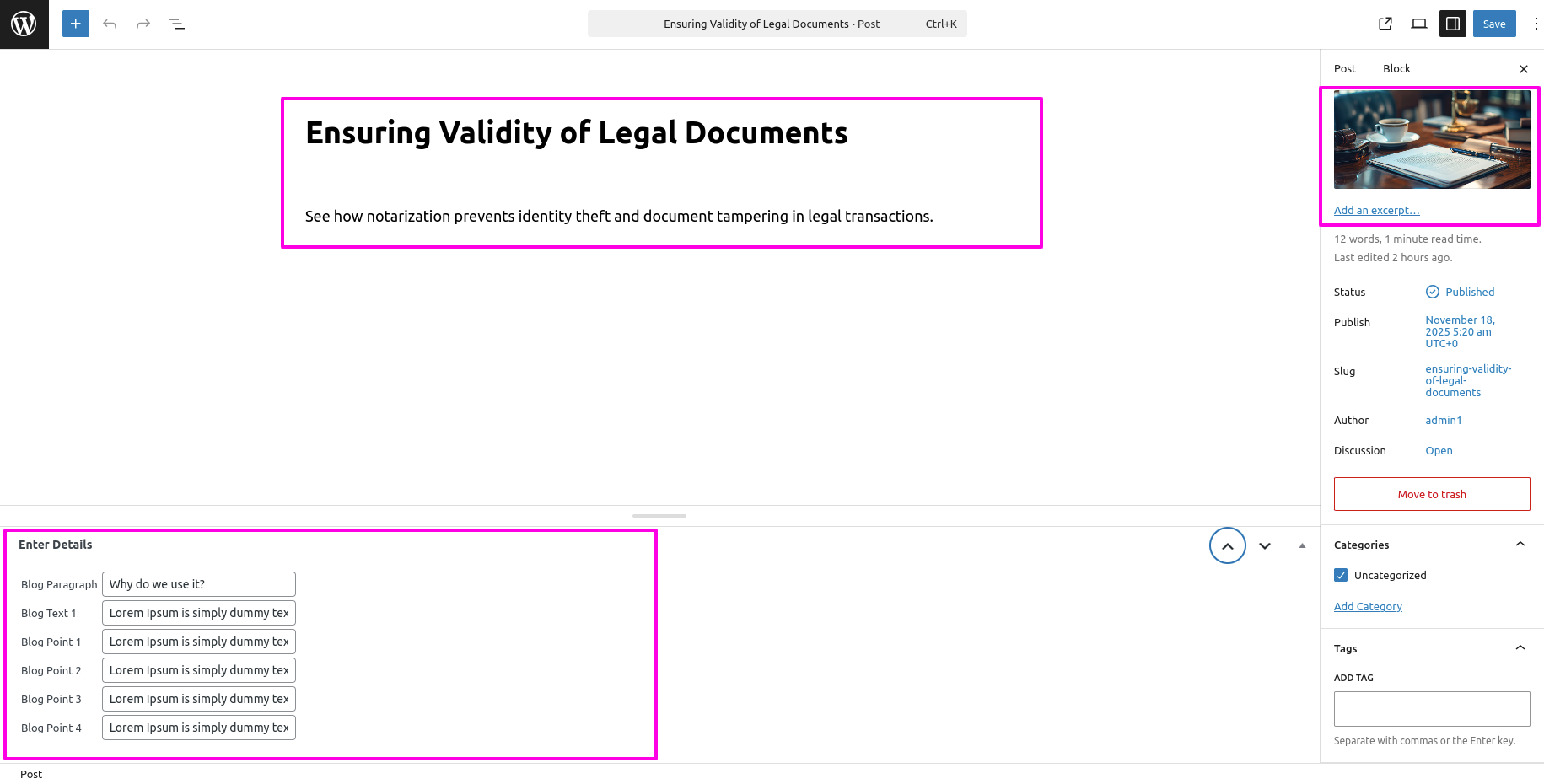 Installing and activating the Online Notary Pro Custom Posttype /strong> Plugin is required for the Post section. The dashboard's Post section will show up after activation.