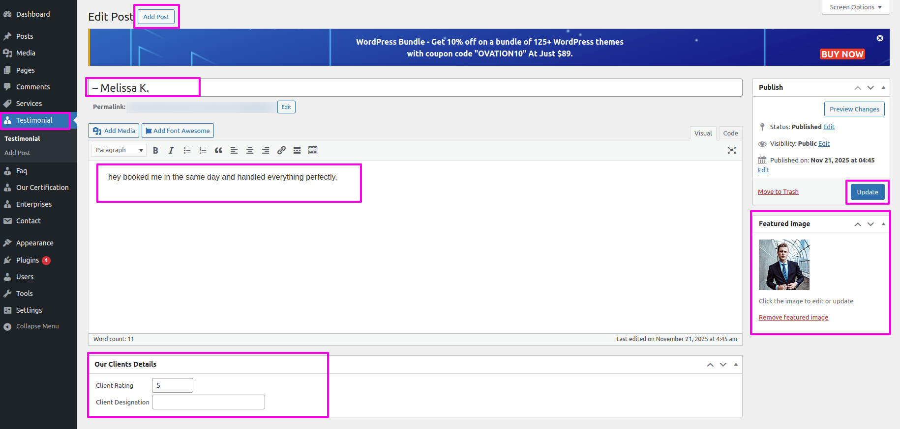 To ensure that Configuring the following section Navigate to Dashboard >> Testimonial >>Click On Add new