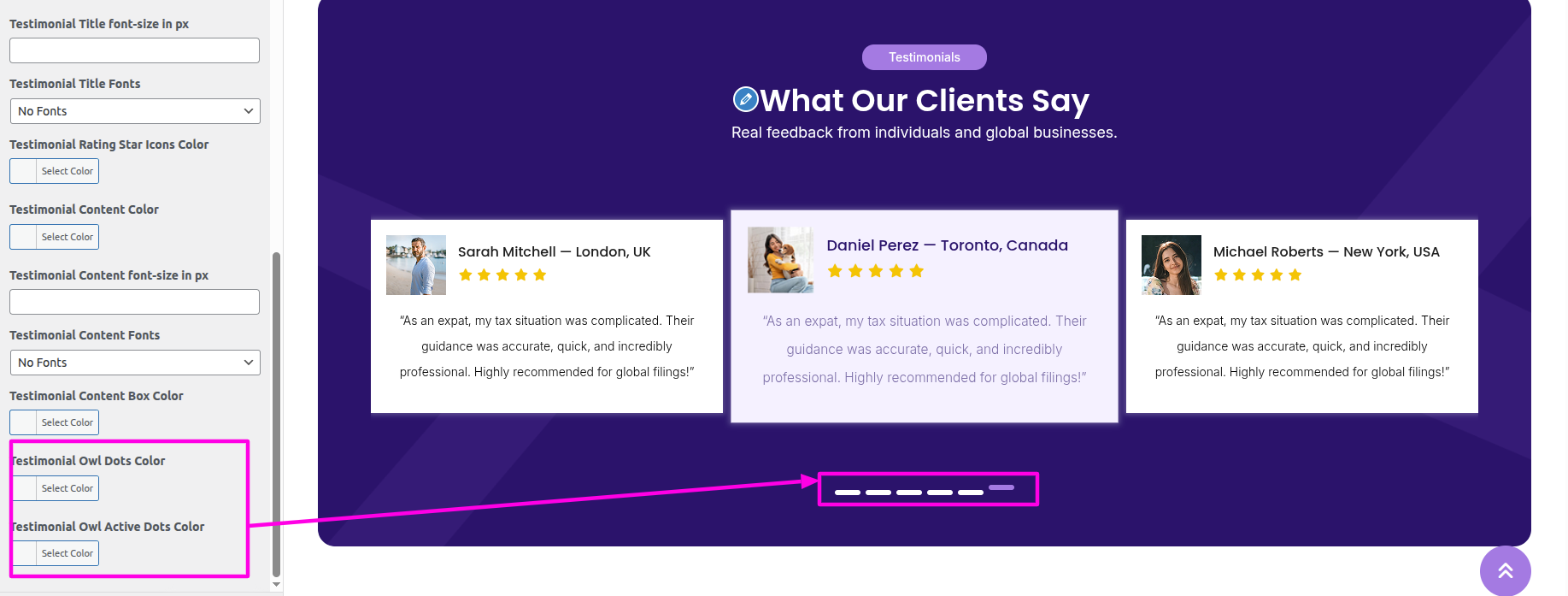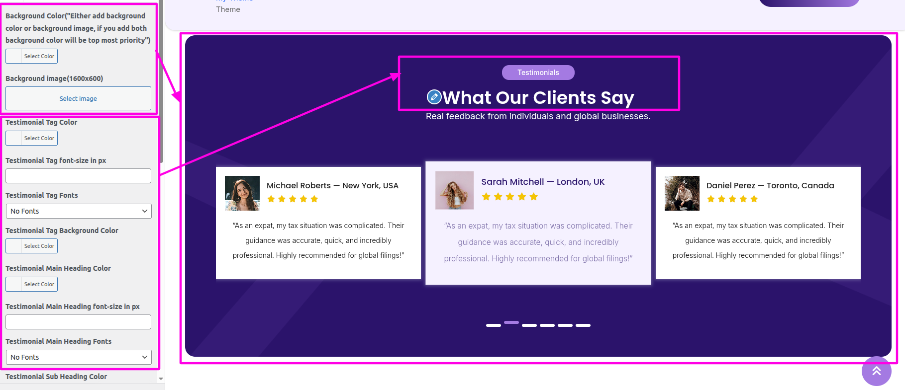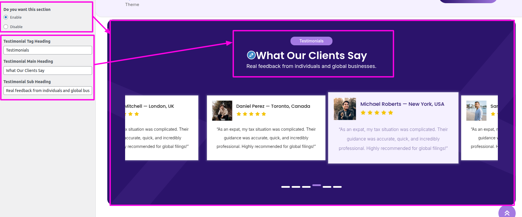 Installation and activation of the Tax Consultant Pro Posttype Plugin are required for the Testimonial section. The dashboard's Testimonial section will show up after activation.