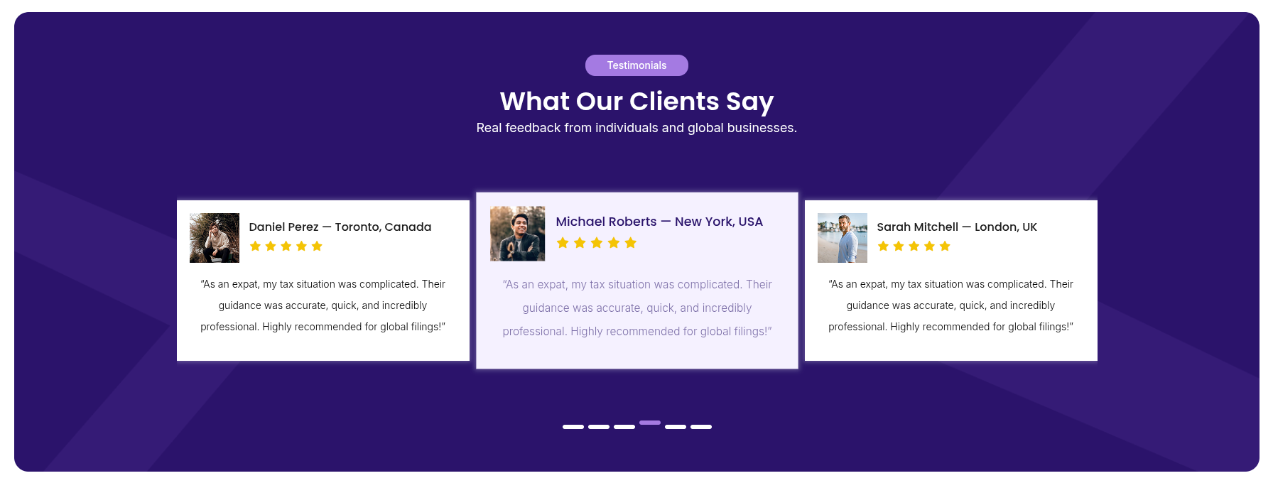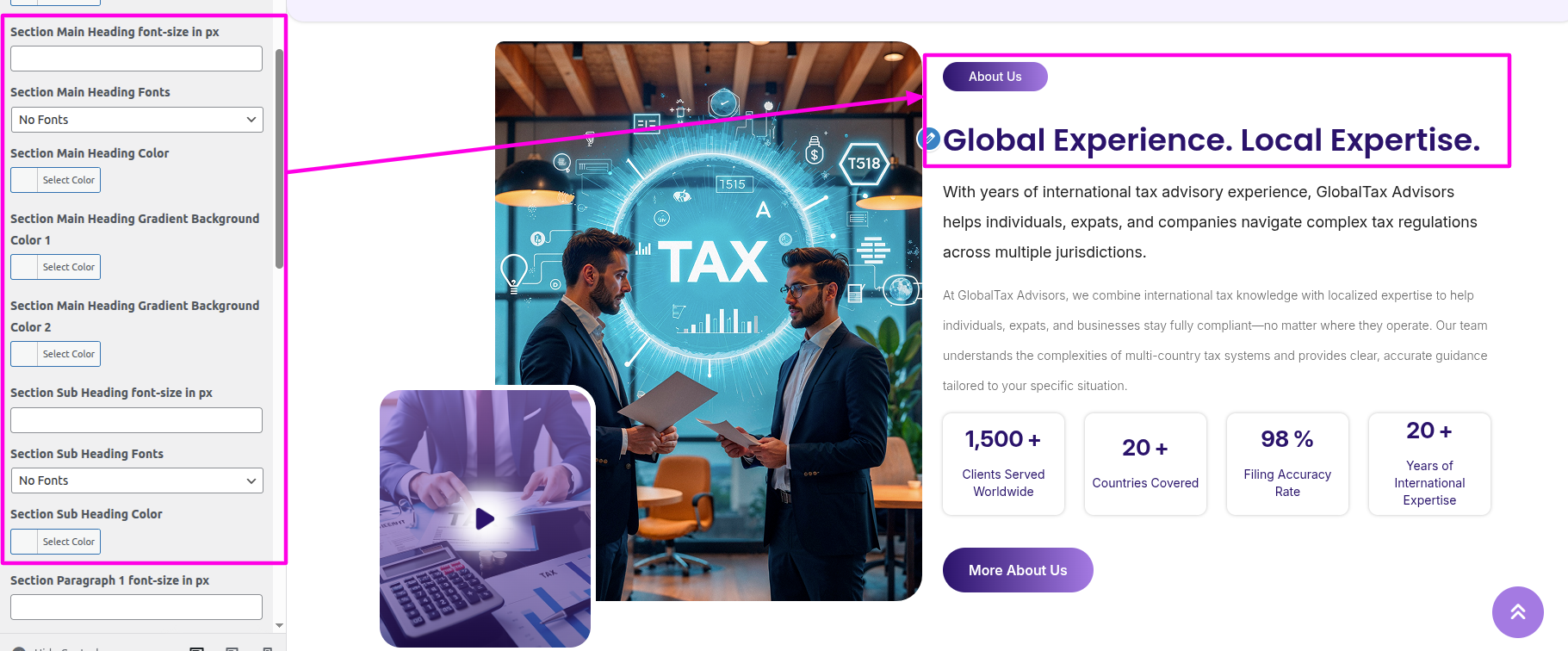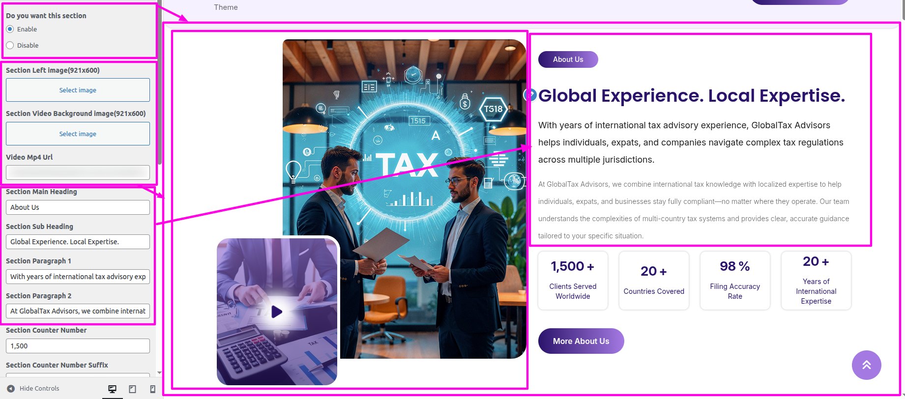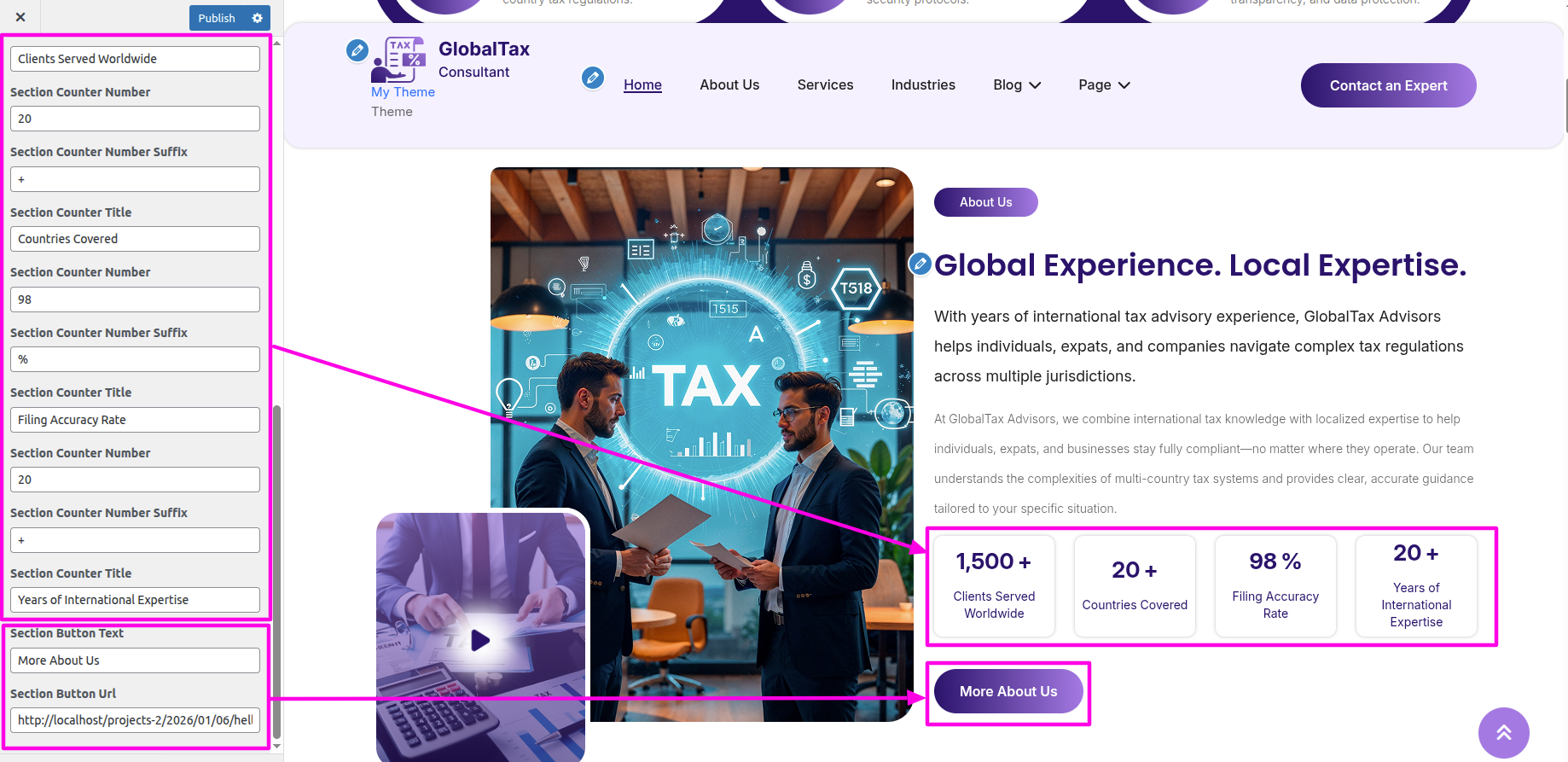 Installation and activation of the Tax Consultant Pro Posttype Plugin are required for the Testimonial section. The dashboard's Testimonial section will show up after activation.