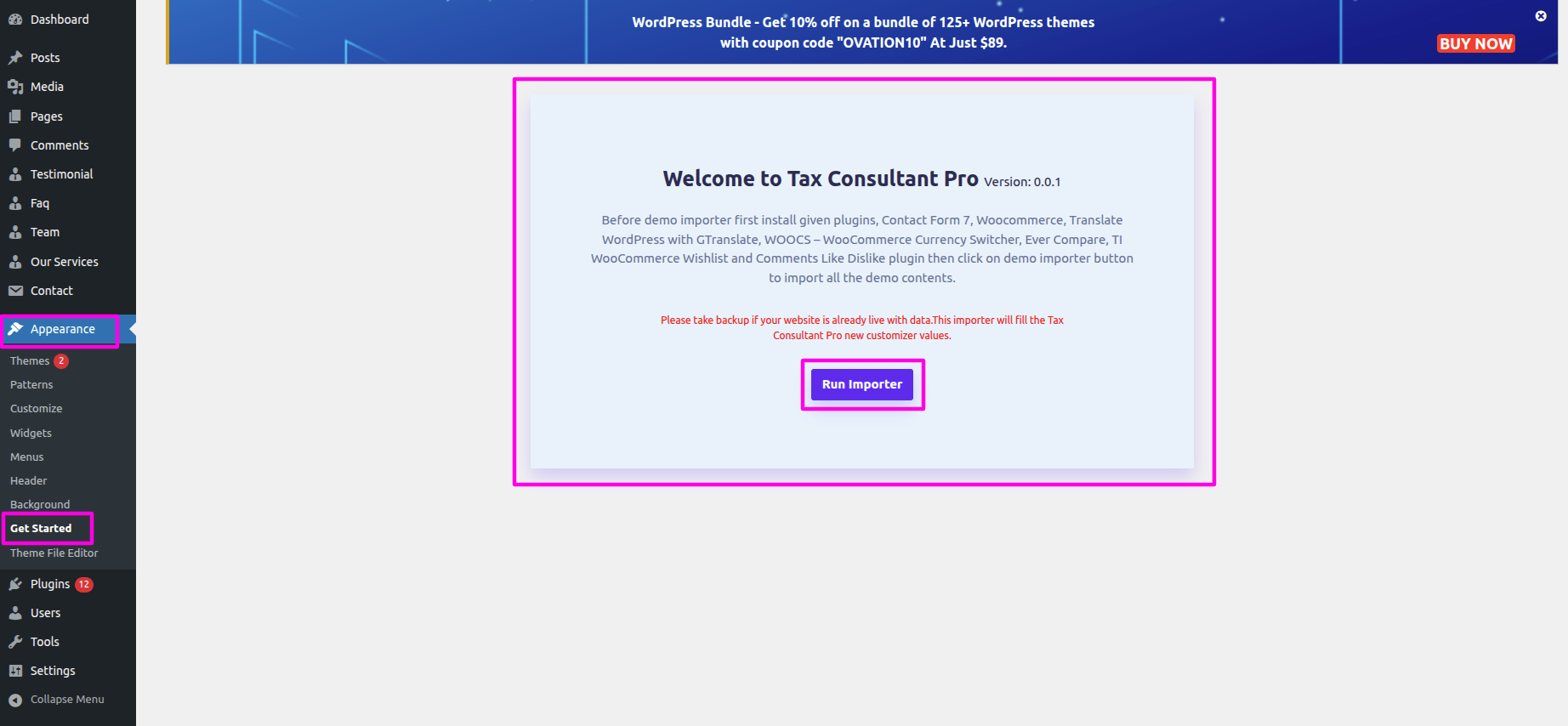 Import demonstration content with one click to get your theme Set-up. This content will lead you through creating your website.