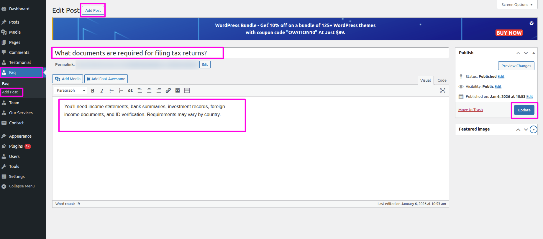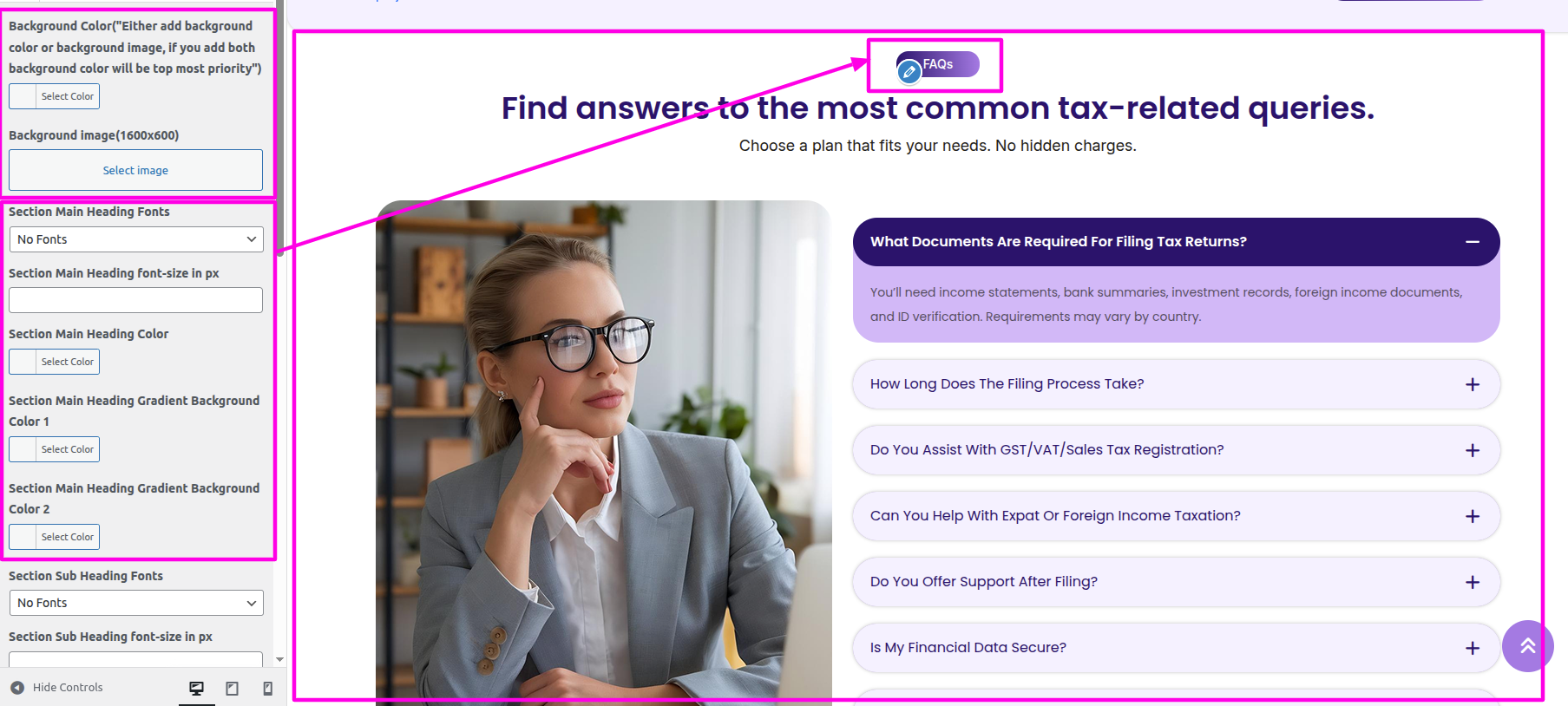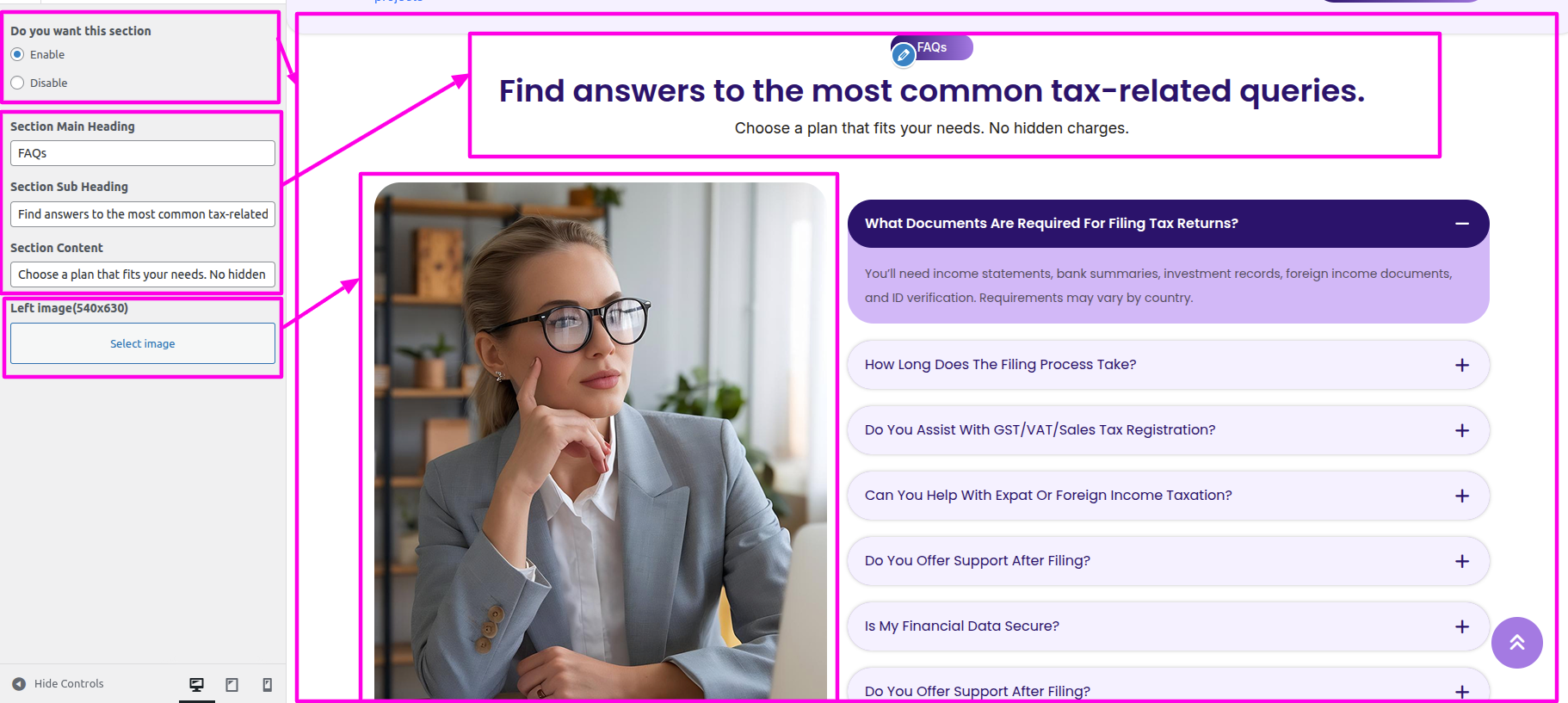 Installation and activation of the Tax Consultant Pro Posttype Plugin are required for the FAQs section. The dashboard's FAQs section will show up after activation.