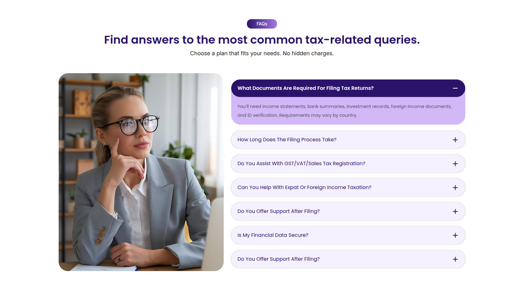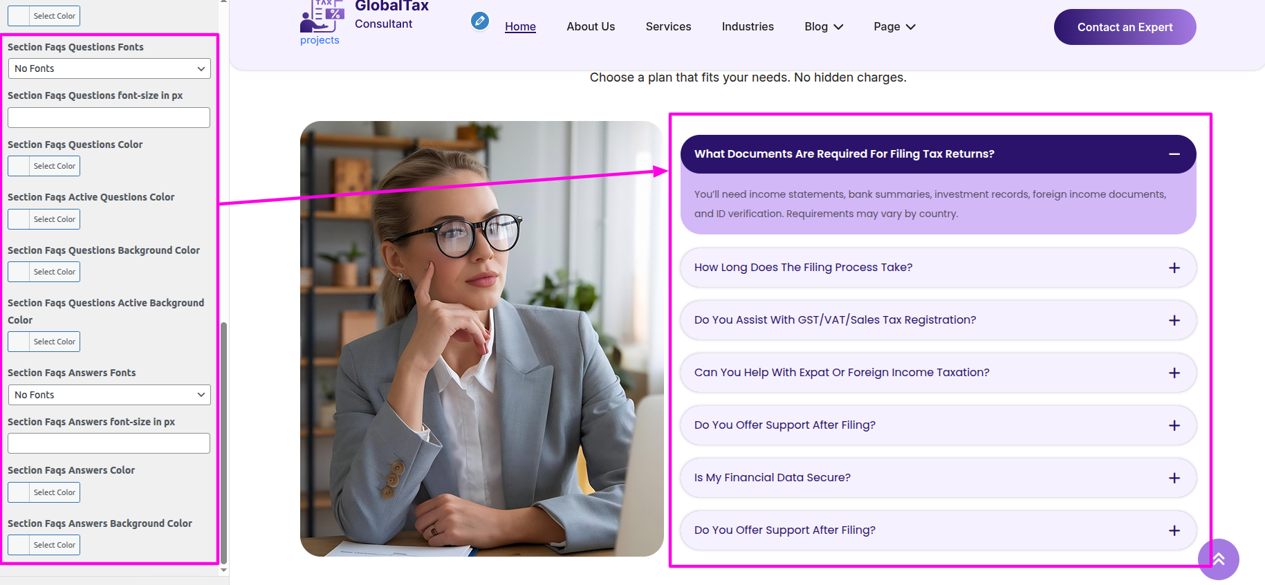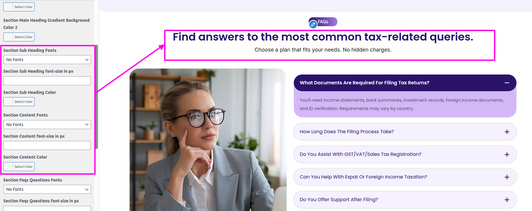 Installation and activation of the Tax Consultant Pro Posttype Plugin are required for the FAQs section. The dashboard's FAQs section will show up after activation.