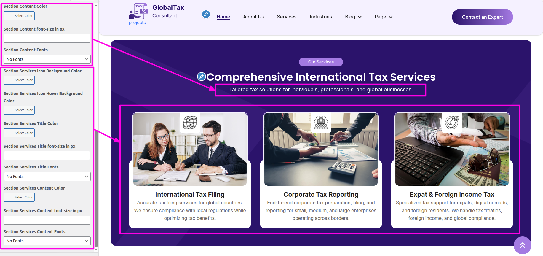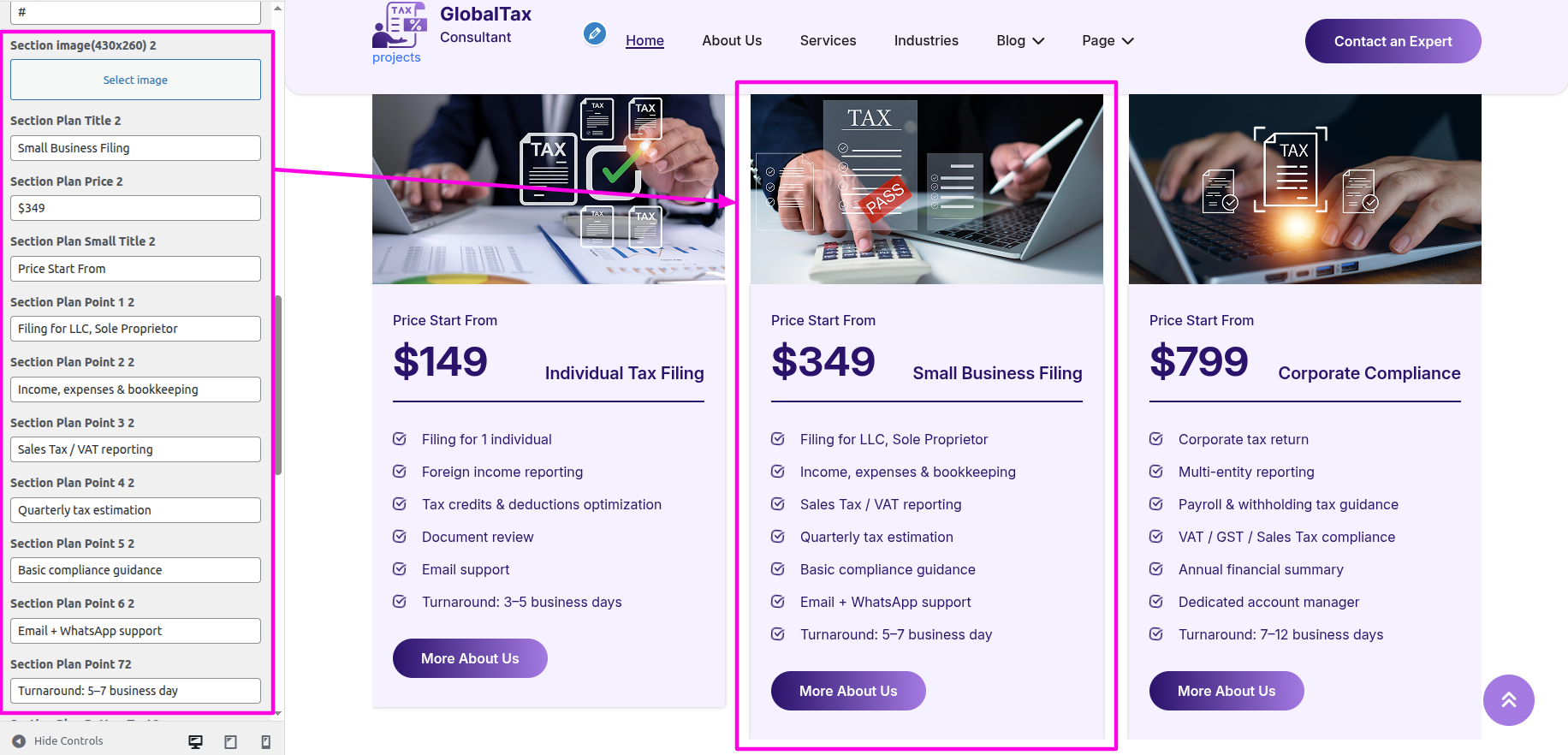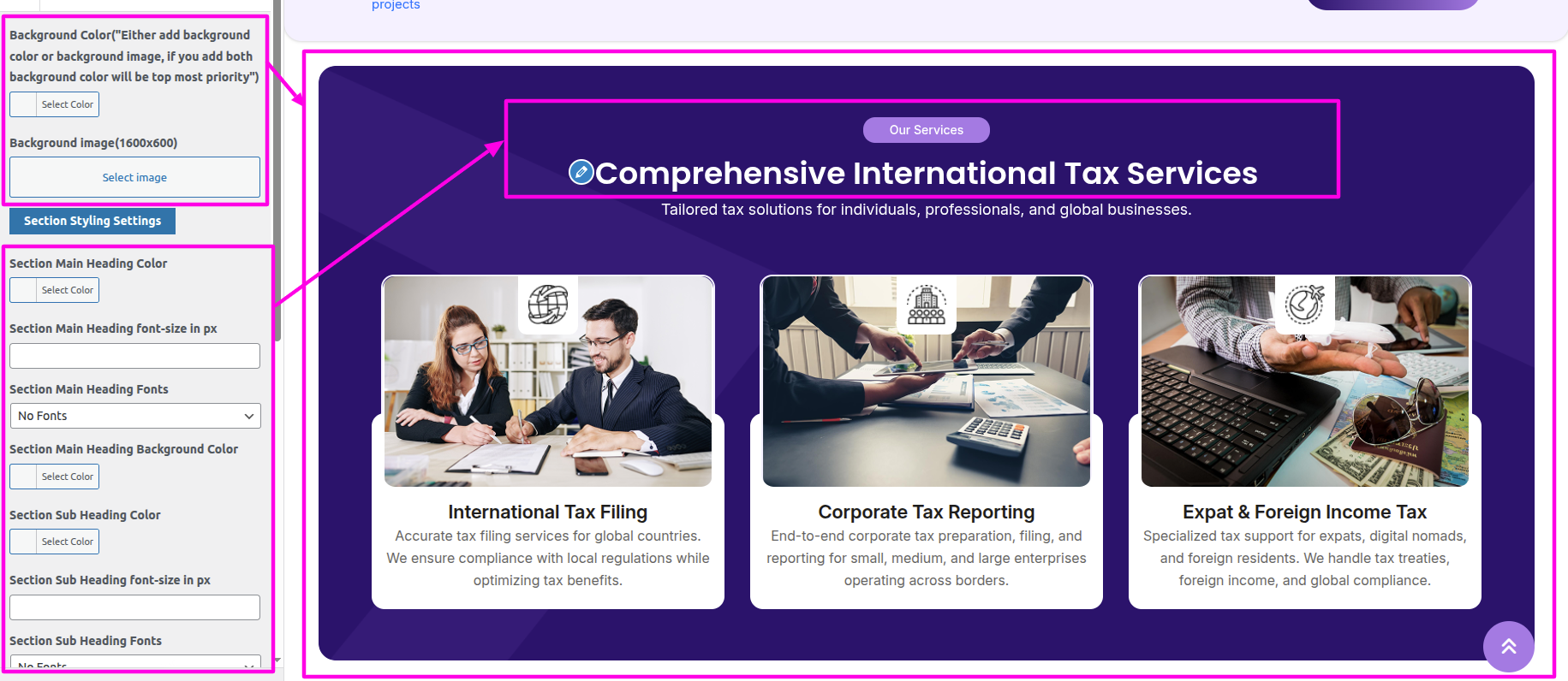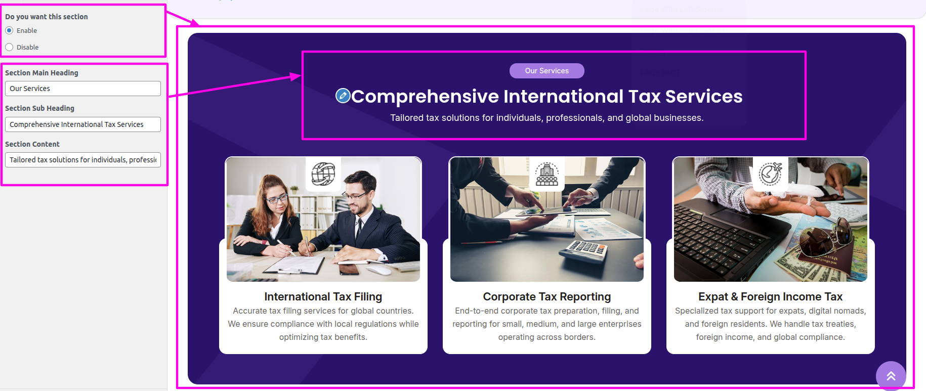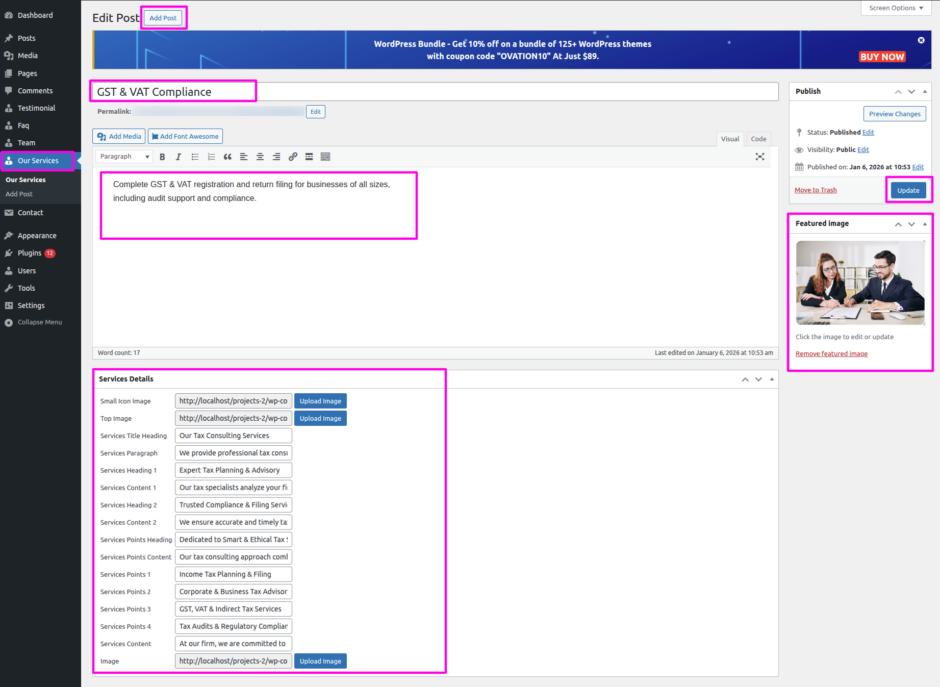 Installation and activation of the Tax Consultant Pro Posttype Plugin are required for the Our Services section. The dashboard's Our Services section will show up after activation.