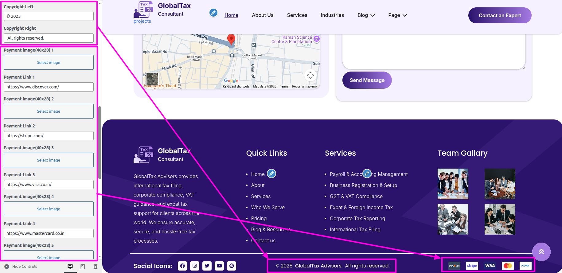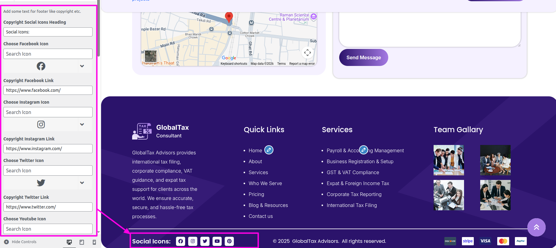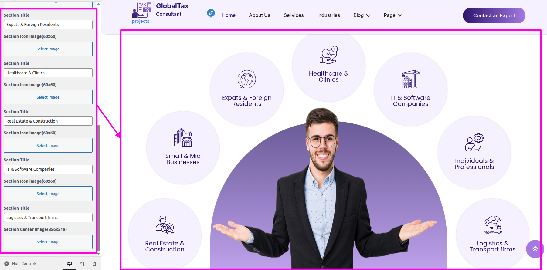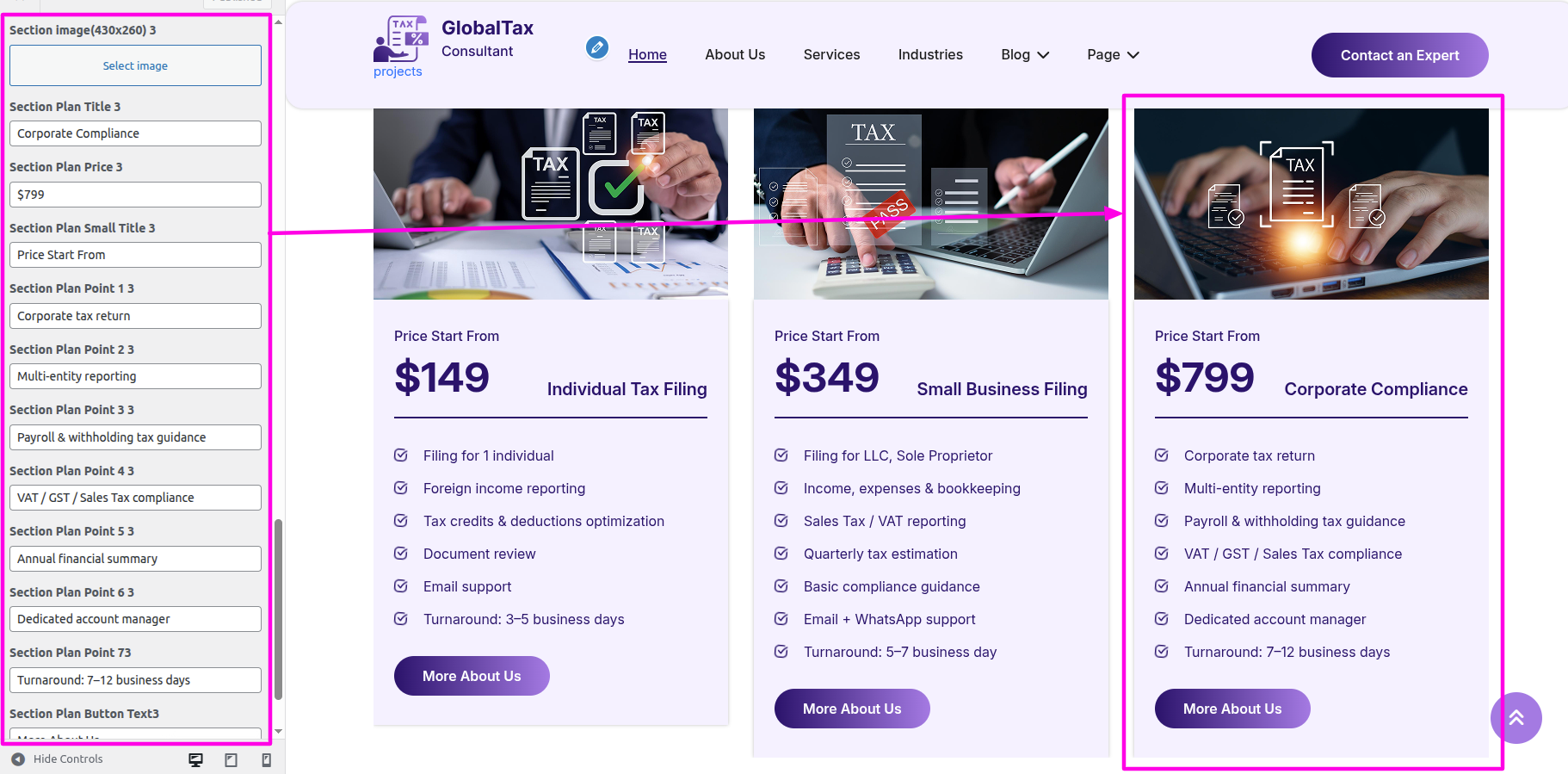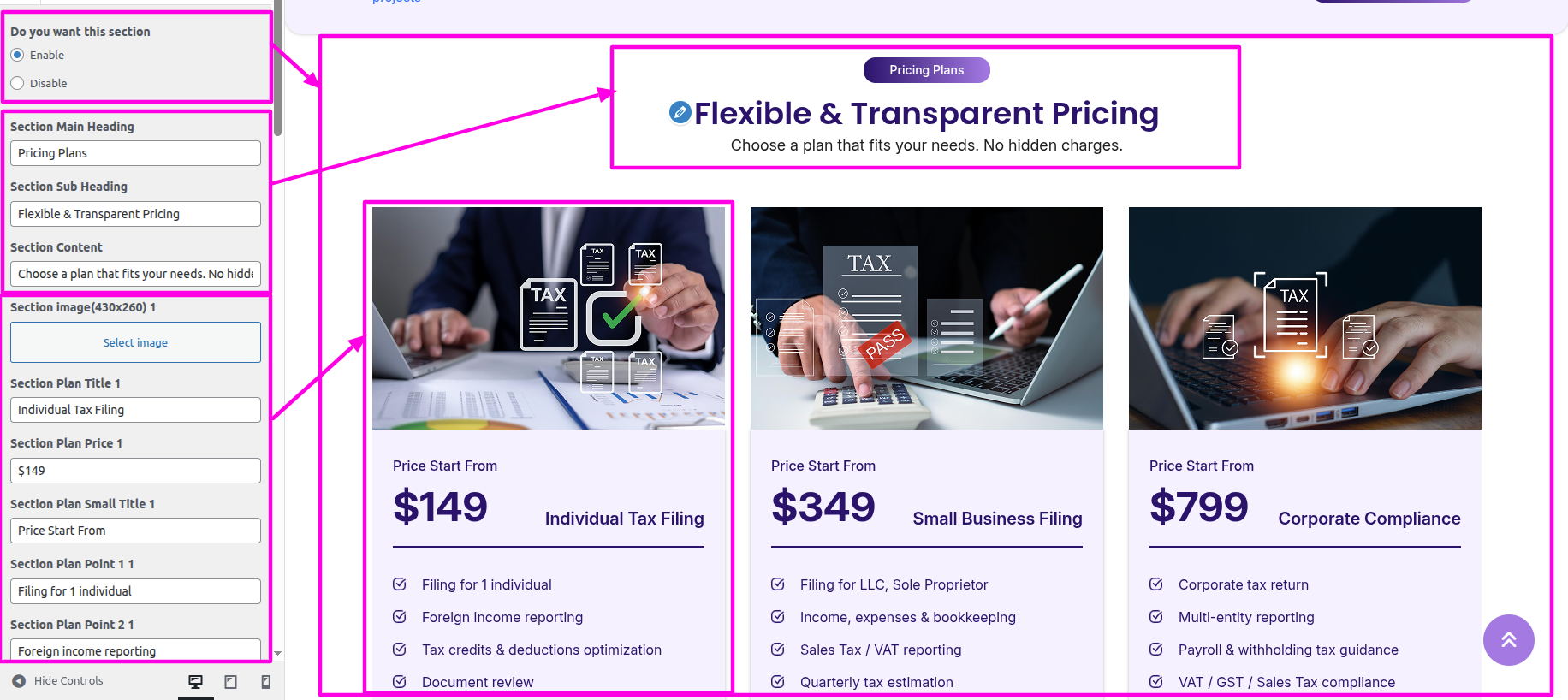Installation and activation of the Tax Consultant Pro Posttype Plugin are required for the Our Services section. The dashboard's Our Services section will show up after activation.