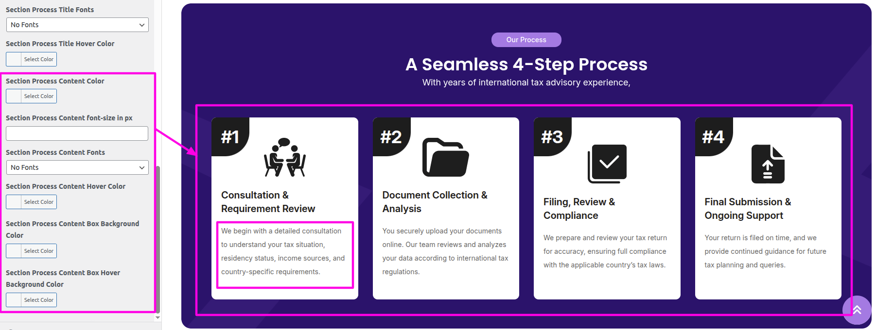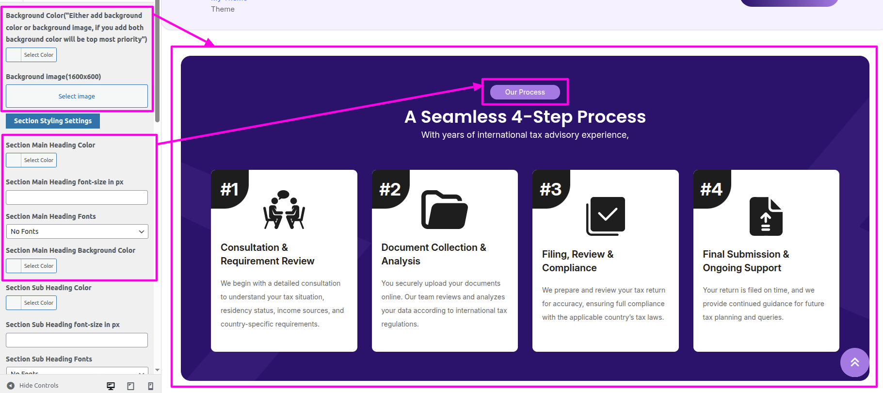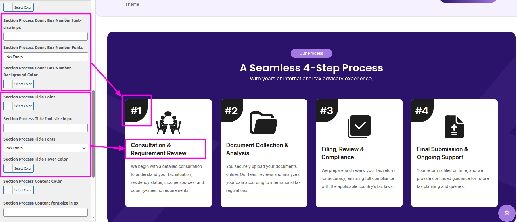Select The Appearance → Select The Customize → Theme Settings → Our Process → Style Settings