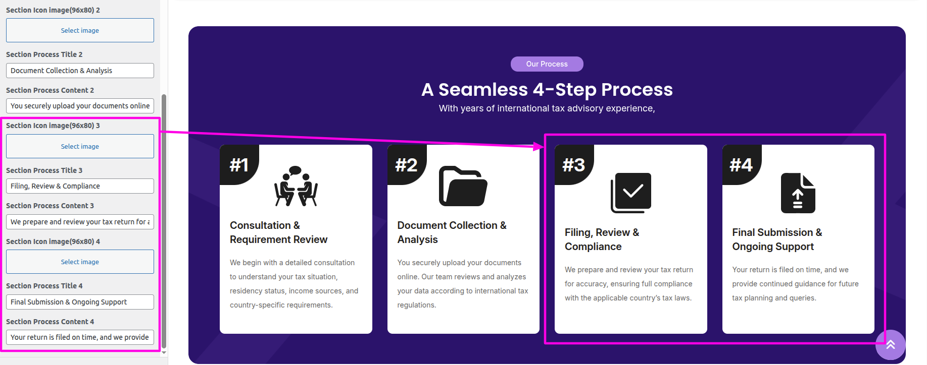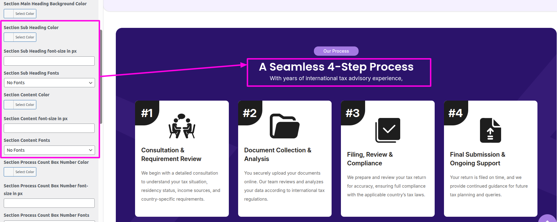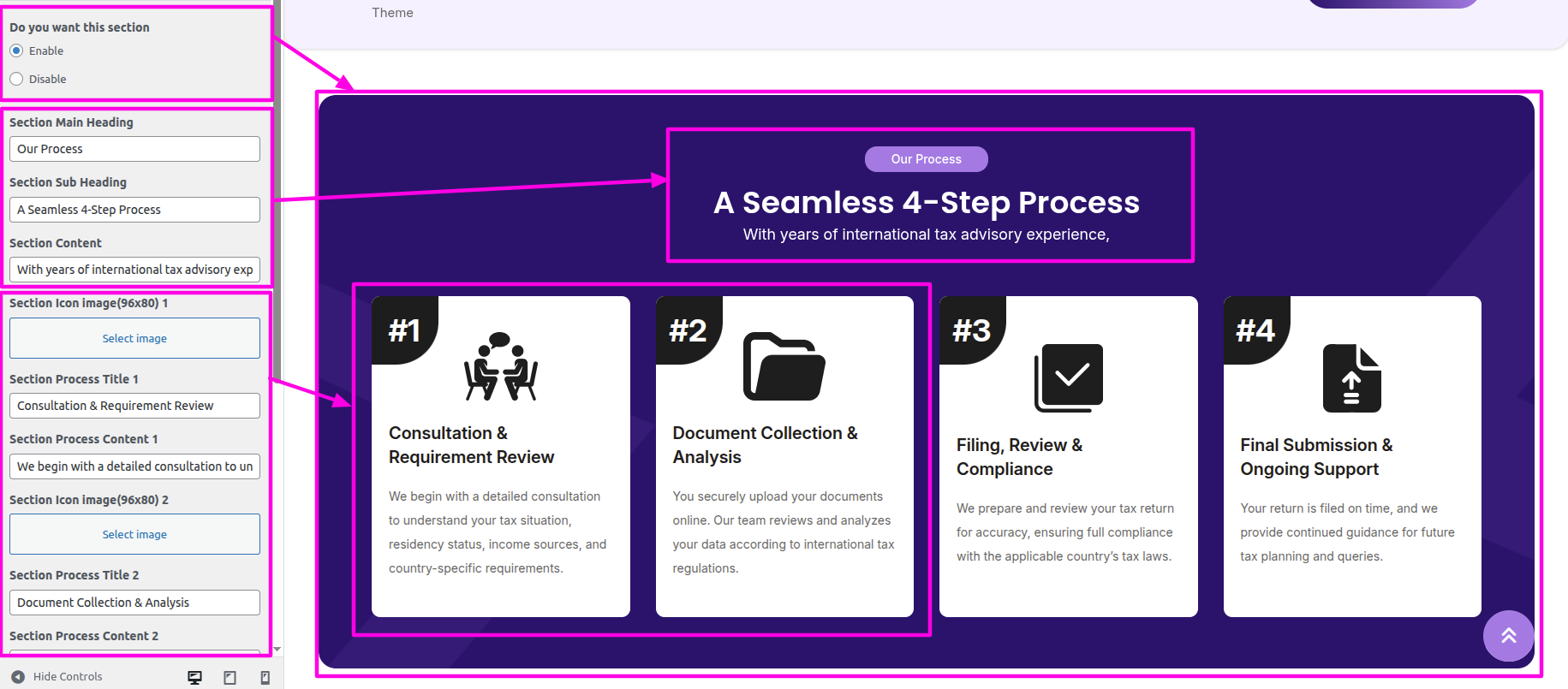 Select The Appearance → Select The Customize → Theme Settings → Our Process → Style Settings
