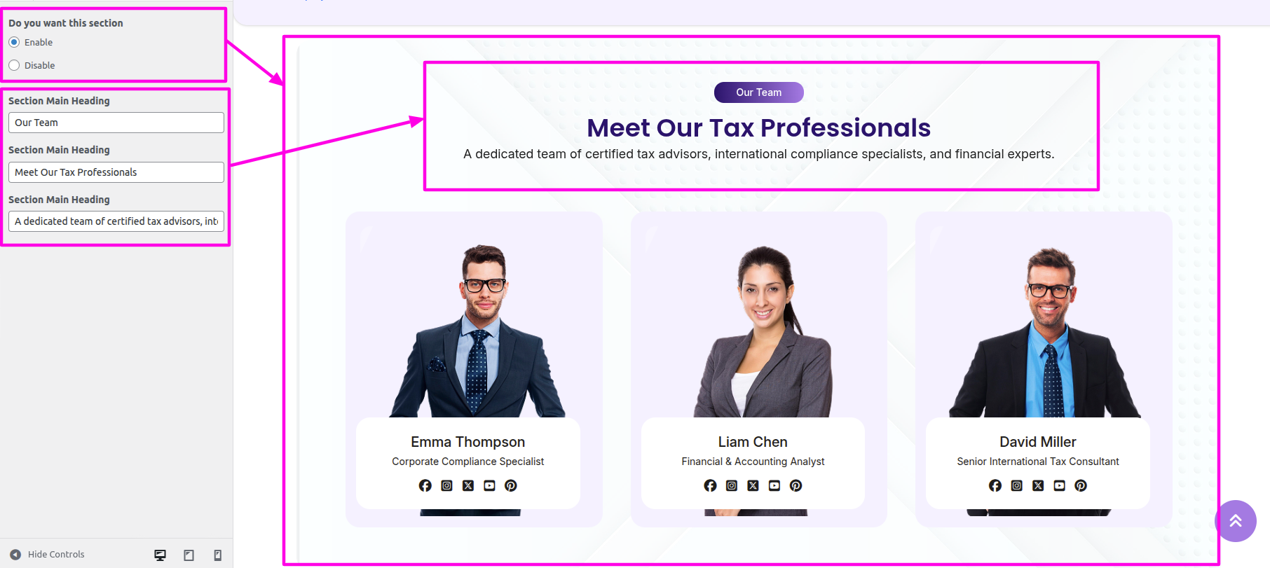 Installation and activation of the Tax Consultant Pro Posttype Plugin are required for the Team section. The dashboard's Team section will show up after activation.