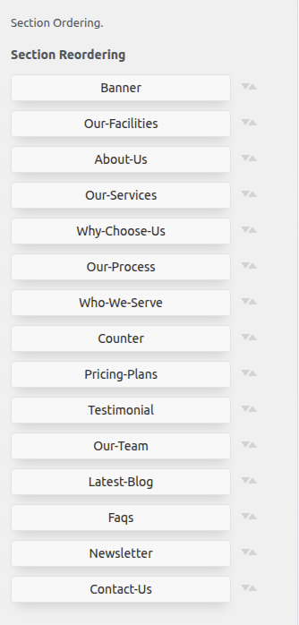 Section reordering means to arranage the section as per our requirement. first you need to choose section and drag section on top or bottom where you need it. when you will drap any section your front view will change according to your choice.