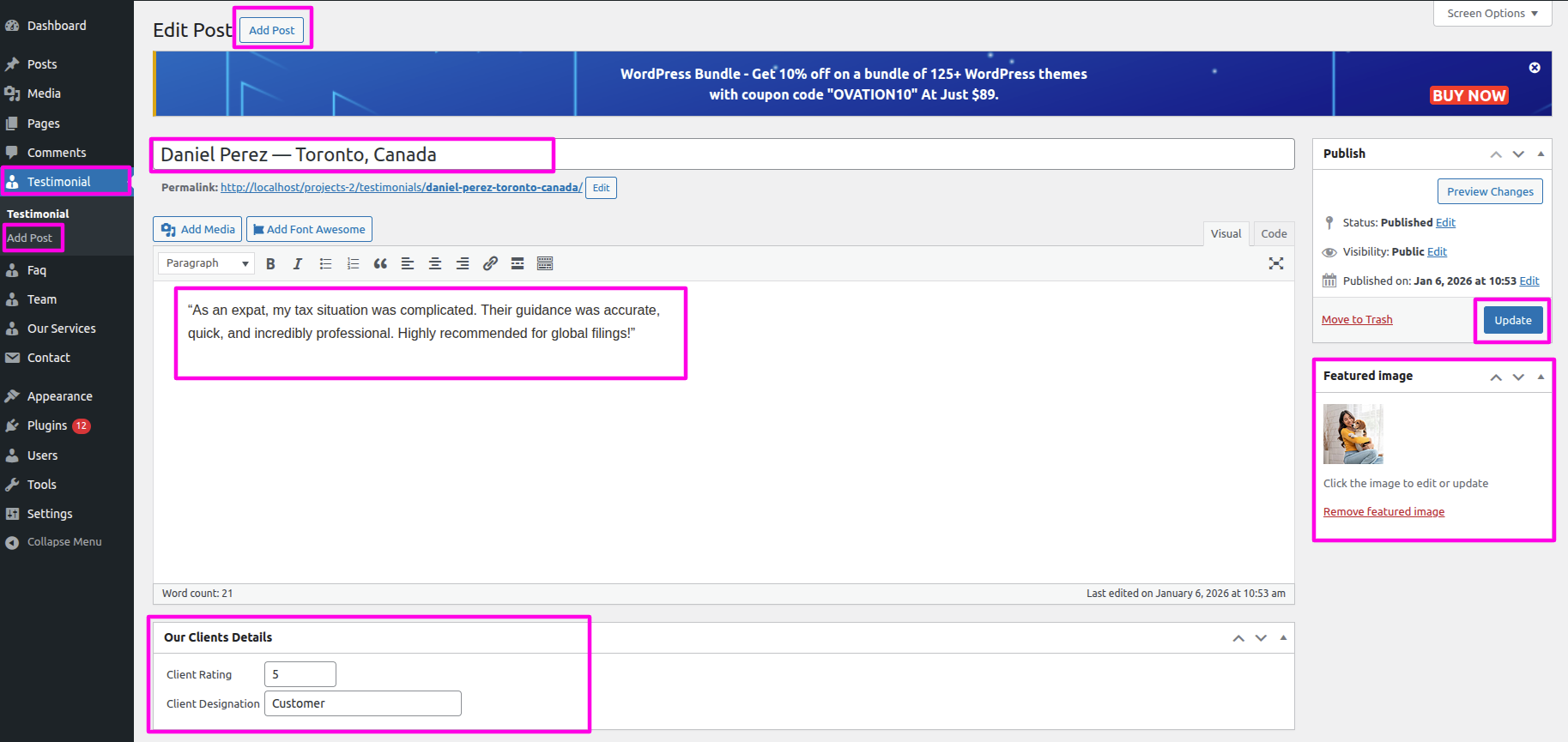 To ensure that Configuring the following section Navigate to Dashboard >> Testimonial >>Click On Add new
