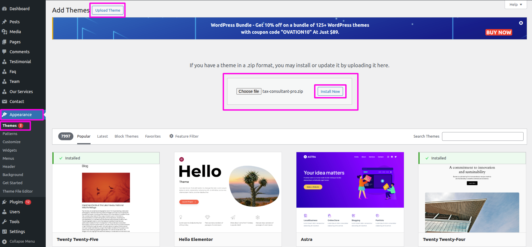 4. Select "Browse" to install the theme file and select it from your device the tax-consultant-pro theme theme on your WordPress website. Click "Install Now" to start the installation procedure after you've chosen the file.
