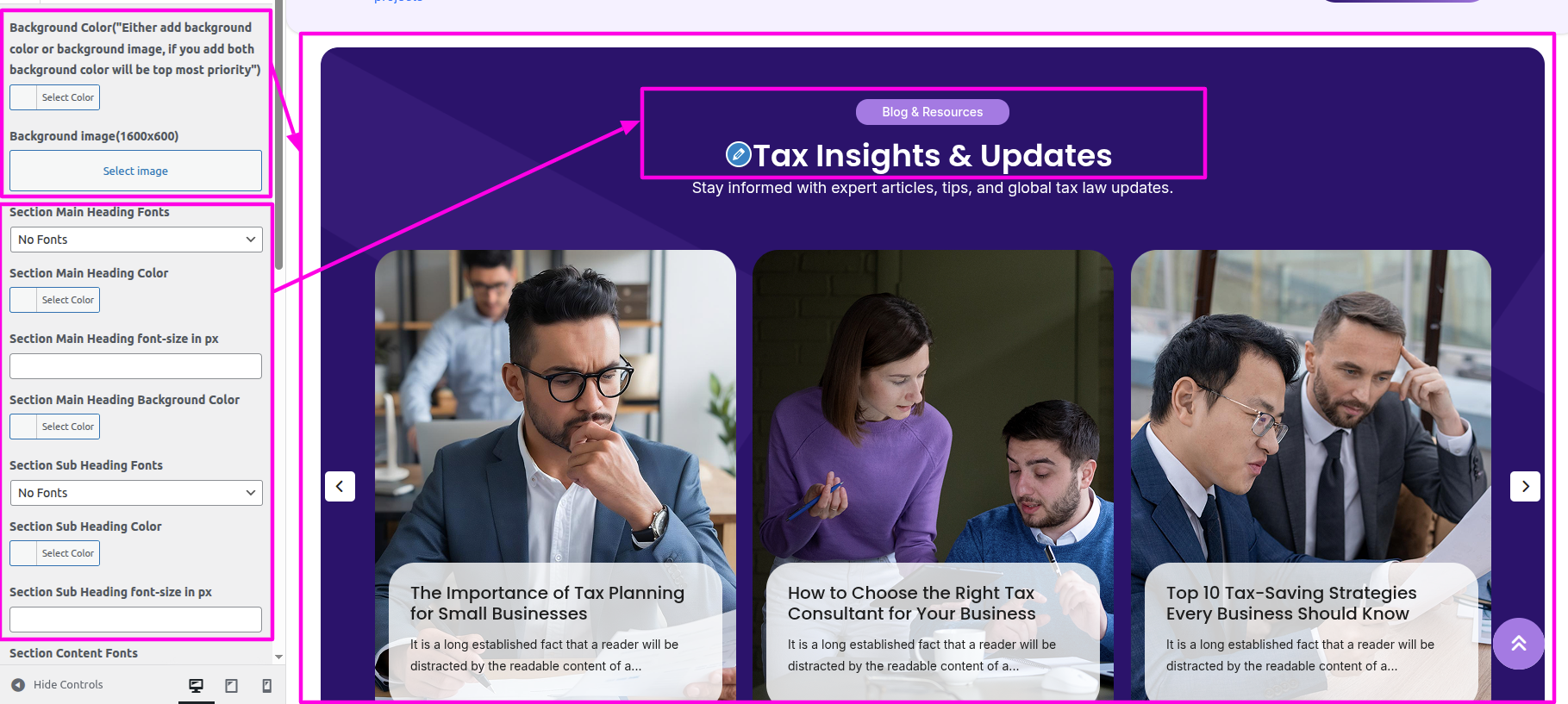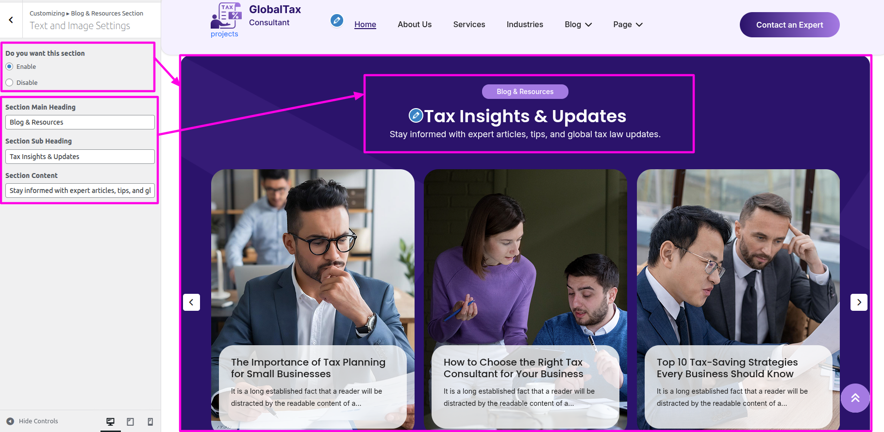 Select The Appearance → Select The Customize → Theme Settings → Our Blog → Text and Image Settings